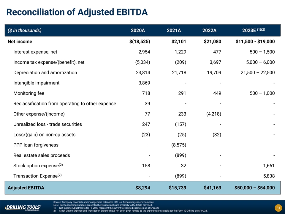 Reconciliation of Adjusted EBITDA (1)(2) ($ in thousands) 2020A 2021A 2022A 2023E Net income $(18,525) $2,101 $21,080 $11,500 - $19,000 Interest expense, net 2,954 1,229 477 500 – 1,500 Income tax expense/(benefit), net (5,034) (209) 3,697 5,000 – 6,000 Depreciation and amortization 23,814 21,718 19,709 21,500 – 22,500 Intangible impairment 3,869 - - - Monitoring fee 718 291 449 500 – 1,000 Reclassification from operating to other expense 39 - - - Other expense/(income) 77 233 (4,218) - Unrealized loss - trade securities 247 (157) - - Loss/(gain) on non-op assets (23) (25) (32) - PPP loan forgiveness - (8,575) - - Real estate sales proceeds - (899) - - (2) Stock option expense 158 32 - 1,661 (2) Transaction Expense - (899) - 5,838 Adjusted EBITDA $8,294 $15,739 $41,163 $50,000 – $54,000 Source: Company financials and management estimates. DTI is a December year-end company. Note: Due to rounding numbers presented herein may not sum precisely to the totals provided. 1) Net Income Adjustments for FY 2023 represent the current forecasted estimates as of 6/30/23 31 2) Stock Option Expense and Transaction Expense have not been given ranges as the expenses are actuals per the Form 10-Q filing on 8/14/23.