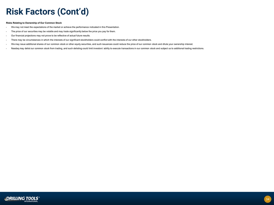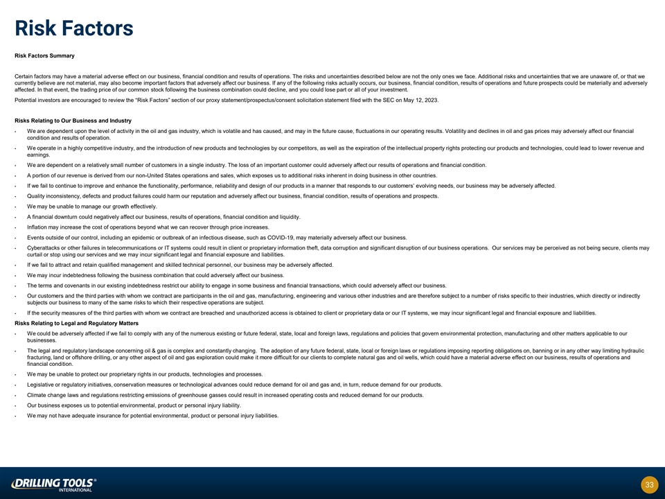 また、将来の出来事や状況に関する予測、予想、その他の特徴づけに言及する記述は、その基礎となる仮定を含め、すべて将来の見通しに関する記述です。本プレスリリースに記載されている将来の見通しに関する記述には、例えば以下のようなものが含まれます:(1) 石油・ガス業界の一般的な活動水準に影響されるDTIの製品およびサービスに対する需要、(2) 顧客、特に収益の大部分を占める顧客を維持するDTIの能力、(3) Drill-N-Reamの北米における唯一の販売代理店であり続けるDTIの能力、(4) 主要な人材を含め、十分な数の熟練した有資格労働者を雇用し、維持するDTIの能力、(5) 競争の激しい業界でサービスを販売するDTIの能力;(9) 買収を実行、統合、実現し、その結果生じる事業の成長を管理するDTIの能力 (6) DTIのツールの操作により生じた損害または危害、あるいは石油・ガス業界に内在する危険な活動から生じる請求に対する潜在的責任 (7) 追加資本を獲得するDTIの能力 (8) 税法または税率の変更を含む、DTIが事業を行う国における潜在的な政治的、規制的、経済的、社会的混乱;(9) DTIの事業を効率的に運営するためのDTIの情報技術システム(特に顧客注文管理ポータルおよびサポートシステム)への依存 (10) 環境、温室効果ガス、気候変動に関連するものを含む、適用される法律、規制、規則を遵守するDTIの能力 (11) 開示統制および財務報告に係る内部統制の効果的なシステムを維持するDTIの能力 (12) DTIの普通株式の市場価格が変動する可能性;(13) 株主代表訴訟の可能性を含む、公開企業として発生する法務、会計、管理およびその他の費用の増加による影響 (14) DTIの普通株式またはその他の株式証券の追加発行の可能性 (15) DTIのナスダックへの普通株式の上場を維持する能力 (16) DTIが米国証券取引委員会(以下「SEC」)に提出した書類および提出の可能性に記載されている、別途提供され、随時示されるその他のリスクおよび不確実性。2023年5月12日に当社がSECに提出した最終的な委任状/目論見書/同意勧誘文(以下「委任状」)、および2023年6月27日に提出されたDTIのフォーム8-Kによる最新報告書(以下「8-K」)および2023年8月[14日]に提出されたフォーム10-Qによる四半期報告書(以下「10-Q」)に記載された情報を慎重に検討する必要があります。このような将来の見通しに関する記述は、DTIの経営陣の確信、およびDTIの経営陣が行った仮定、およびDTIの経営陣が現在入手可能な情報に基づいています。実際の結果は、委任状、8-Kまたは10-Qに詳述されている特定の要因の結果、将来予想に関する記述によって予期されるものとは大きく異なる可能性があります。当社または当社を代表して行動する者に帰属する、その後の書面または口頭による将来予想に関する記述はすべて、この段落によってその全体が限定されています。将来予想に関する記述は、委任状説明書のリスク要因のセクションに記載され、8-Kおよび10-Qに記載されたものを含め、DTIが制御できない多くの条件の影響を受けます。当社は、法律で義務付けられている場合を除き、本リリースの日付以降、これらの記述を修正または変更するために更新する義務を負いません。