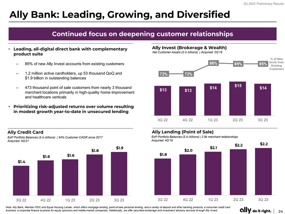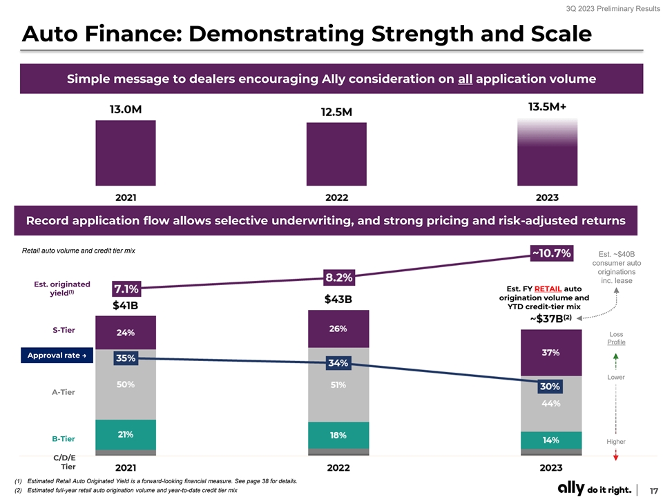 | “Our leading franchises continue to demonstrate the benefits of scale and strength we’ve built over the past decade. Across Dealer Financial Services we decisioned a record 3.7 million consumer applications, driving $10.6 billion of originations at attractive risk-adjusted returns and Insurance earned $324 million of premiums, the highest since 2009. At Ally Bank, we reached 3 million retail deposit customers, including 95 thousand new customers in the quarter. Retail deposits totaled $140 billion and 92% of balances are FDIC insured. These results are a testament to the strong execution against our strategic priorities as we head into the final quarter of 2023.”