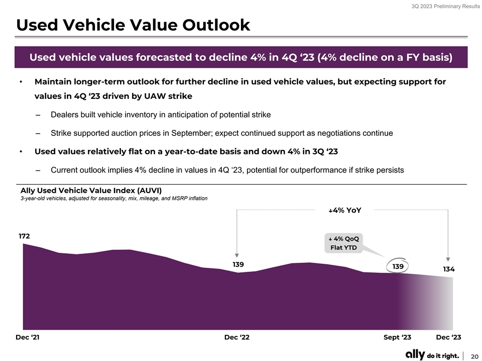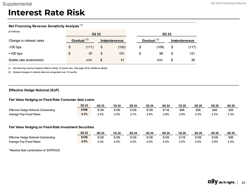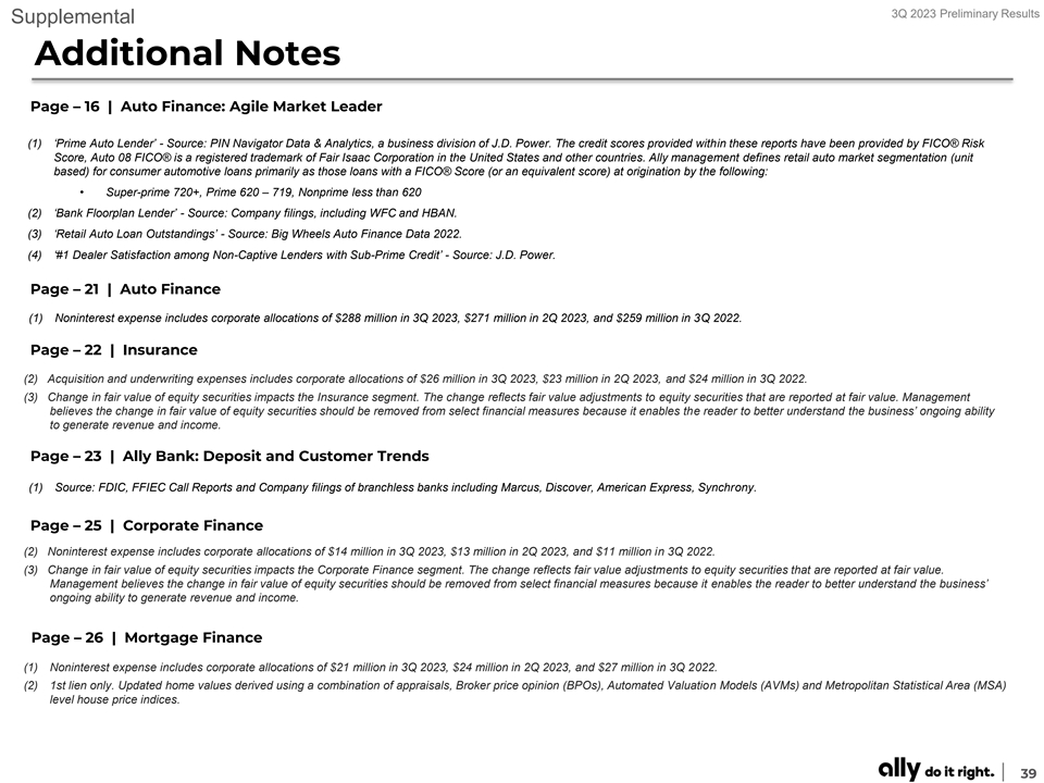 “Ally reported solid operating and financial results in the third quarter which reflect our commitment to drive long-term value for all stakeholders,” said Chief Executive Officer Jeffrey J. Brown. “The interest rate backdrop, including high short-term rates, affected third quarter results and will continue to do so in the near-term as the balance sheet gradually reprices. As we navigate a dynamic market backdrop, we remain focused on the controllables and have taken steps to prepare for a variety of operating environments.”