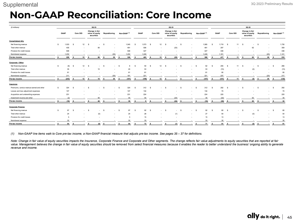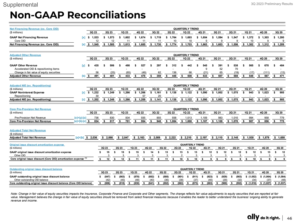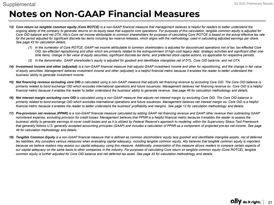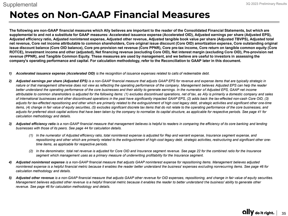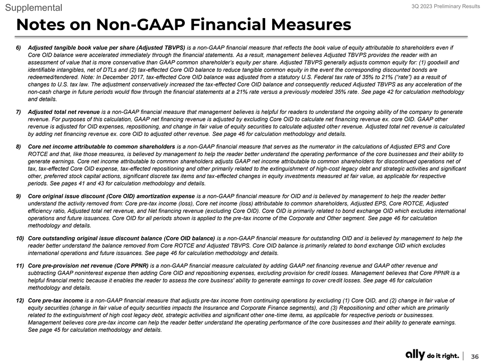 The following are non-GAAP financial measures which Ally believes are important to the reader of the Consolidated Financial Statements, but which are supplemental to and not a substitute for GAAP measures: Accelerated issuance expense (Accelerated OID), Adjusted earnings per share (Adjusted EPS), Adjusted efficiency ratio, Adjusted noninterest expense, Adjusted other revenue, Adjusted tangible book value per share (Adjusted TBVPS), Adjusted total net revenue, Core net income attributable to common shareholders, Core original issue discount (Core OID) amortization expense, Core outstanding original issue discount balance (Core OID balance), Core pre-provision net revenue (Core PPNR), Core pre-tax income, Core return on tangible common equity (Core ROTCE), Investment income and other (adjusted), Net financing revenue (excluding Core OID), Net interest margin (excluding Core OID), Pre-provision net revenue (PPNR), and Tangible Common Equity. These measures are used by management and we believe are useful to investors in assessing the company’s operating performance and capital.