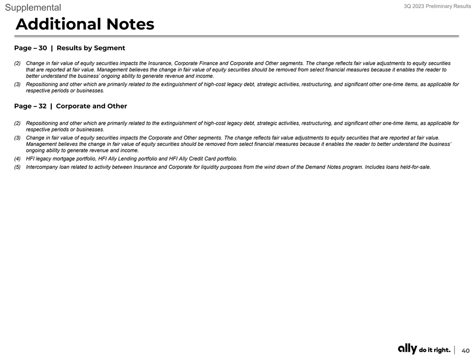 2) Adjusted earnings per share (Adjusted EPS) is a non-GAAP financial measure that adjusts GAAP EPS for revenue and expense items that are typically strategic in nature or that management otherwise does not view as reflecting the operating performance of the company. Management believes Adjusted EPS can help the reader better understand the operating performance of the core businesses and their ability to generate earnings. In the numerator of Adjusted EPS, GAAP net income attributable to common shareholders is adjusted for the following items: (1) excludes discontinued operations, net of tax, as Ally is primarily a domestic company and sales of international businesses and other discontinued operations in the past have significantly impacted GAAP EPS, (2) adds back the tax-effected non-cash Core OID, (3) adjusts for tax-effected repositioning and other which are primarily related to the extinguishment of high cost legacy debt, strategic activities and significant other onetime items, (4) change in fair value of equity securities, (5) excludes significant discrete tax items that do not relate to the operating performance of the core businesses, and adjusts for preferred stock capital actions that have been taken by the company to normalize its capital structure, as applicable for respective periods.