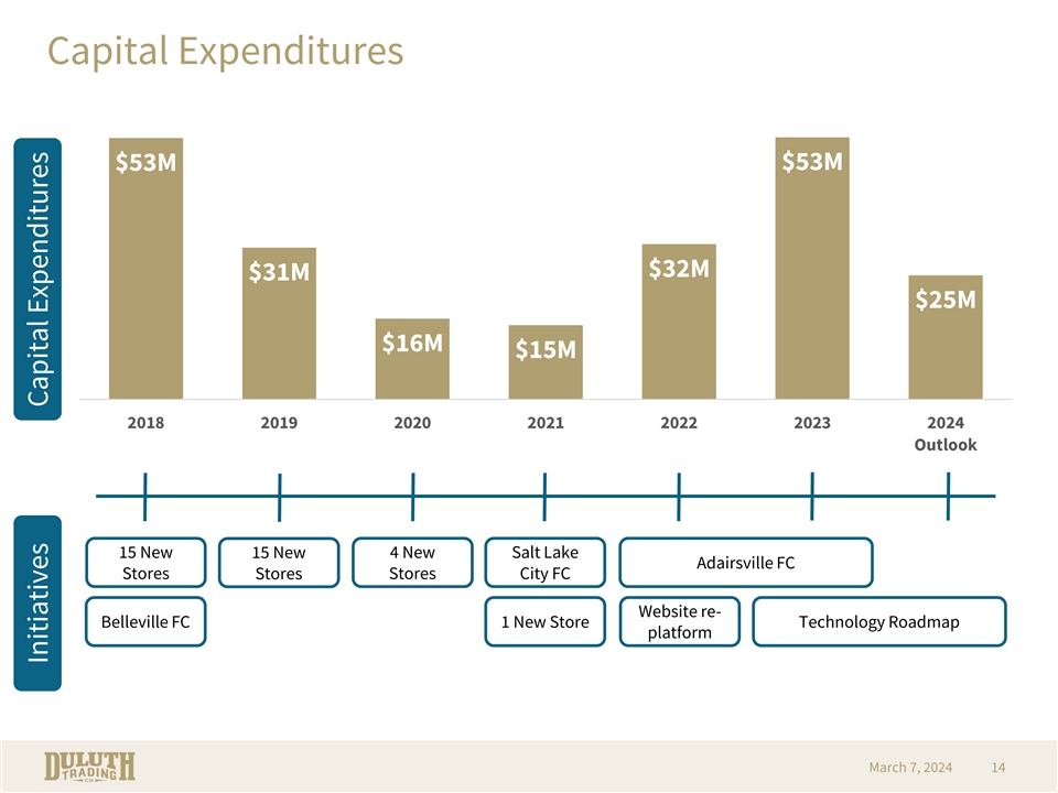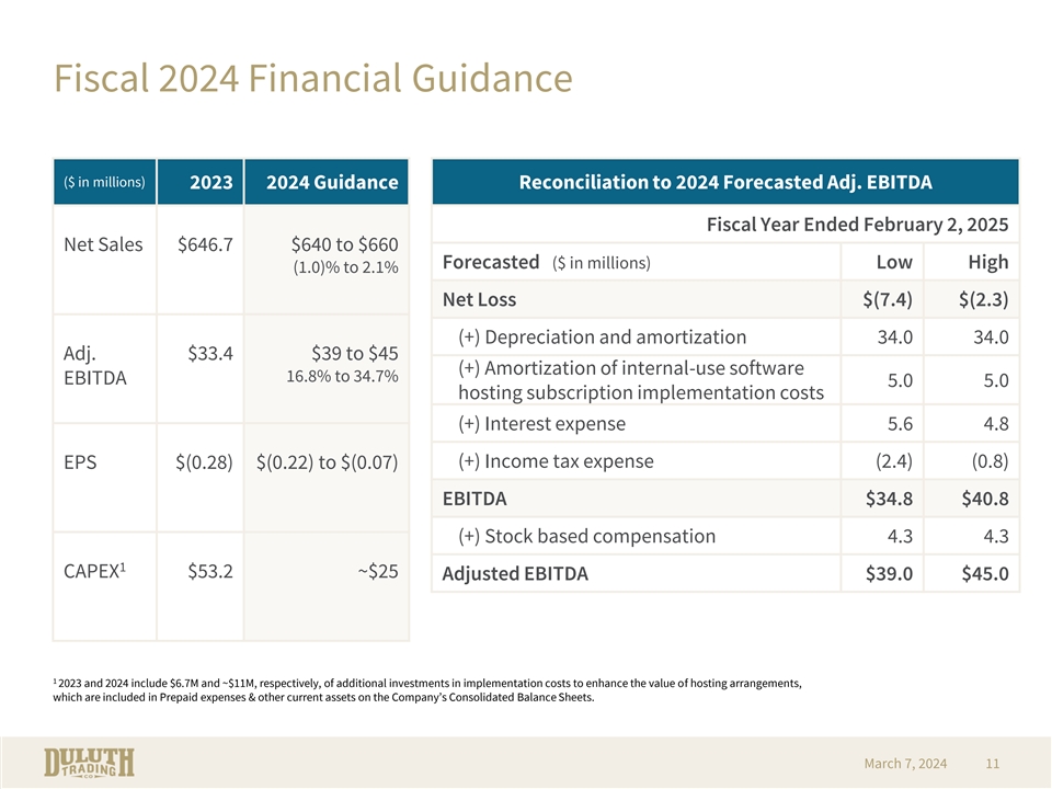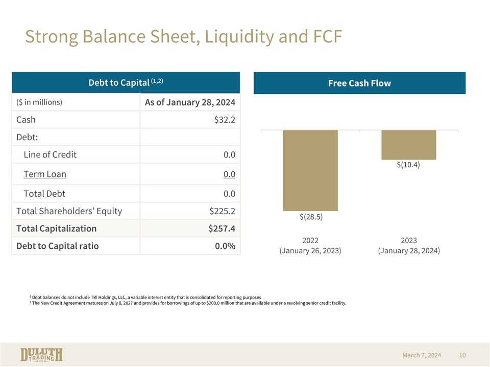 当四半期末の現金残高は約3,220万ドル、正味運転資本は7,850万ドルで、ダルース・トレーディングの銀行借入残高はありません。2023年度の資本支出は5,320万ドルで、これにはソフトウェア・ホスティングの導入費用270万ドルが含まれており、当社連結貸借対照表の前払費用およびその他の流動資産に含まれています。