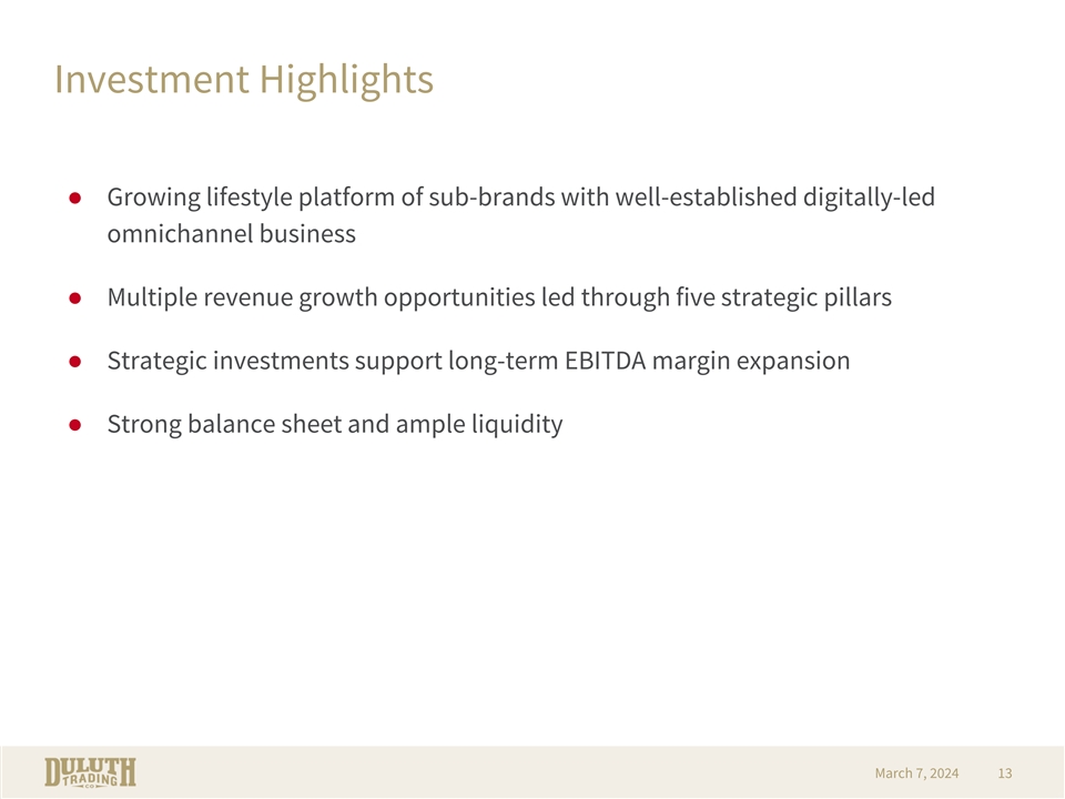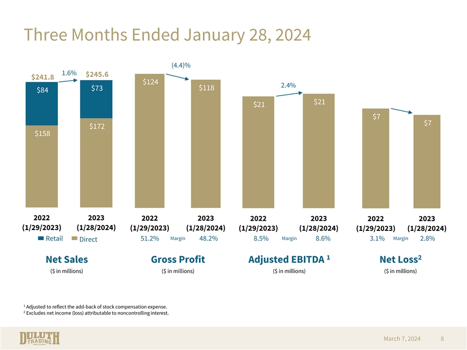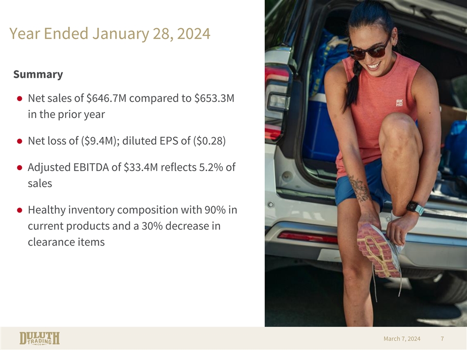 ウィスコンシン州マウントホーブ-2024年3月7日-メンズおよびレディースのワークウェア、カジュアルウェア、アウトドアウェア、アクセサリーのライフスタイル・ブランドであるダルース・ホールディングス・インク(ダルース・トレーディング社)(NASDAQ: DLTH)は本日、2024年1月28日を期末とする第4四半期および会計年度の業績を発表しました。
