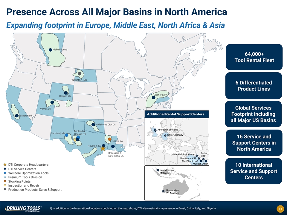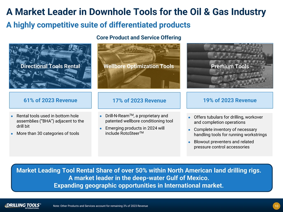 A Market Leader in Downhole Tools for the Oil & Gas Industry A highly competitive suite of differentiated products Core Product and Service Offering Directional Tools Rental Wellbore Optimization Tools Premium Tools 61% of 2023 Revenue 19% of 2023 Revenue 17% of 2023 Revenue TM ⚫ Rental tools used in bottom hole ⚫ Drill-N-Ream , a proprietary and ⚫ Offers tubulars for drilling, workover assemblies (“BHA”) adjacent to the patented wellbore conditioning tool and completion operations drill bit ⚫ Emerging products in 2024 will ⚫ Complete inventory of necessary TM ⚫ More than 30 categories of tools include RotoSteer handling tools for running workstrings ⚫ Blowout preventers and related pressure control accessories Market Leading Tool Rental Share of over 50% within North American land drilling rigs. A market leader in the deep-water Gulf of Mexico. Expanding geographic opportunities in International market. Note: Other Products and Services account for remaining 3% of 2023 Revenue 10