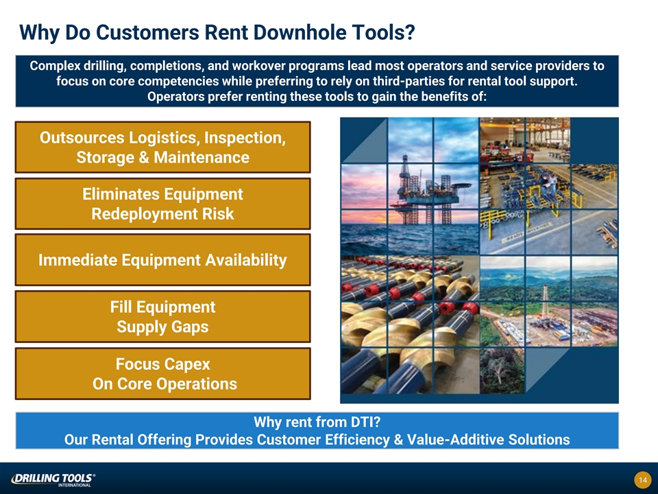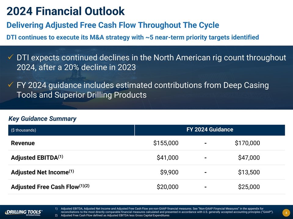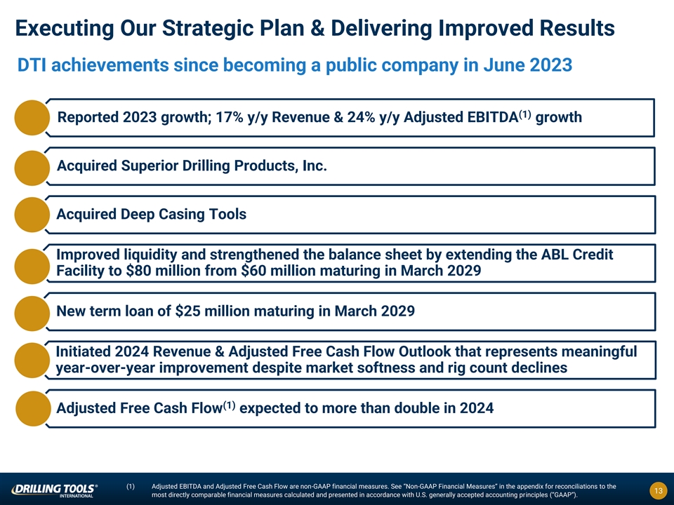 Executing Our Strategic Plan & Delivering Improved Results DTI achievements since becoming a public company in June 2023 (1) Reported 2023 growth; 17% y/y Revenue & 24% y/y Adjusted EBITDA growth Acquired Superior Drilling Products, Inc. Acquired Deep Casing Tools Improved liquidity and strengthened the balance sheet by extending the ABL Credit Facility to $80 million from $60 million maturing in March 2029 New term loan of $25 million maturing in March 2029 Initiated 2024 Revenue & Adjusted Free Cash Flow Outlook that represents meaningful year-over-year improvement despite market softness and rig count declines (1) Adjusted Free Cash Flow expected to more than double in 2024 (1) Adjusted EBITDA and Adjusted Free Cash Flow are non-GAAP financial measures. See “Non-GAAP Financial Measures” in the appendix for reconciliations to the 13 most directly comparable financial measures calculated and presented in accordance with U.S. generally accepted accounting principles (“GAAP”).