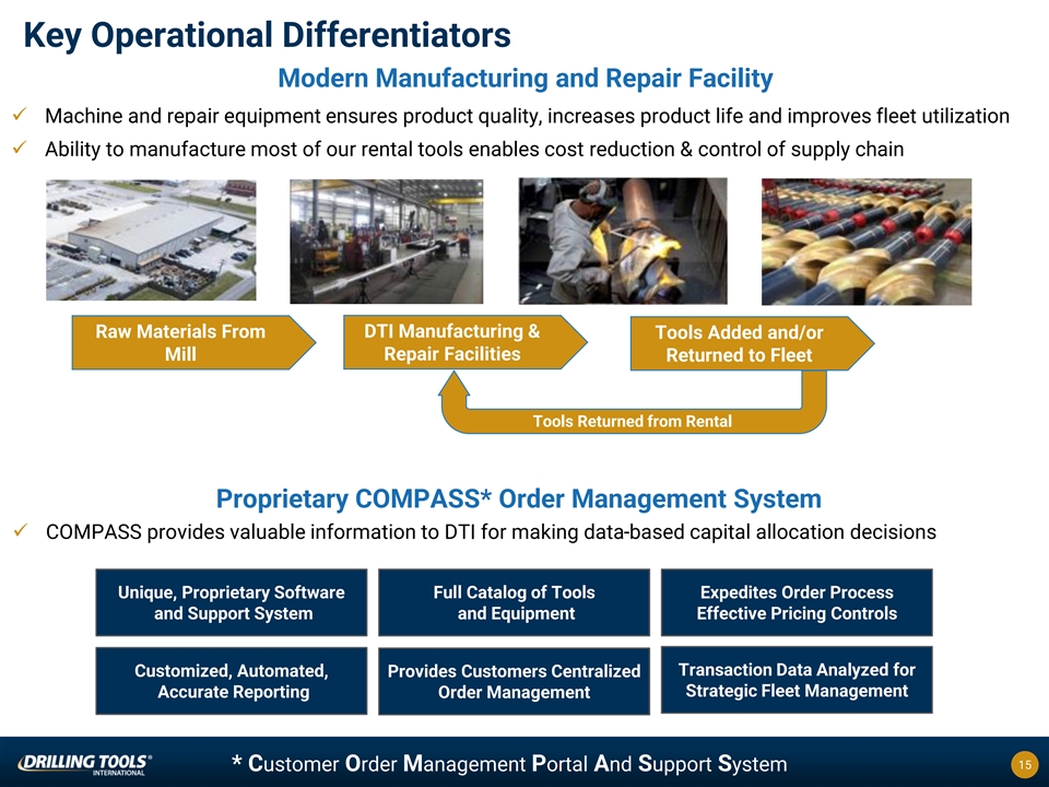 Why Do Customers Rent Downhole Tools? Complex drilling, completions, and workover programs lead most operators and service providers to focus on core competencies while preferring to rely on third-parties for rental tool support. Operators prefer renting these tools to gain the benefits of: Outsources Logistics, Inspection, Storage & Maintenance Eliminates Equipment Redeployment Risk Immediate Equipment Availability Fill Equipment Supply Gaps Focus Capex On Core Operations Why rent from DTI? Our Rental Offering Provides Customer Efficiency & Value-Additive Solutions 14