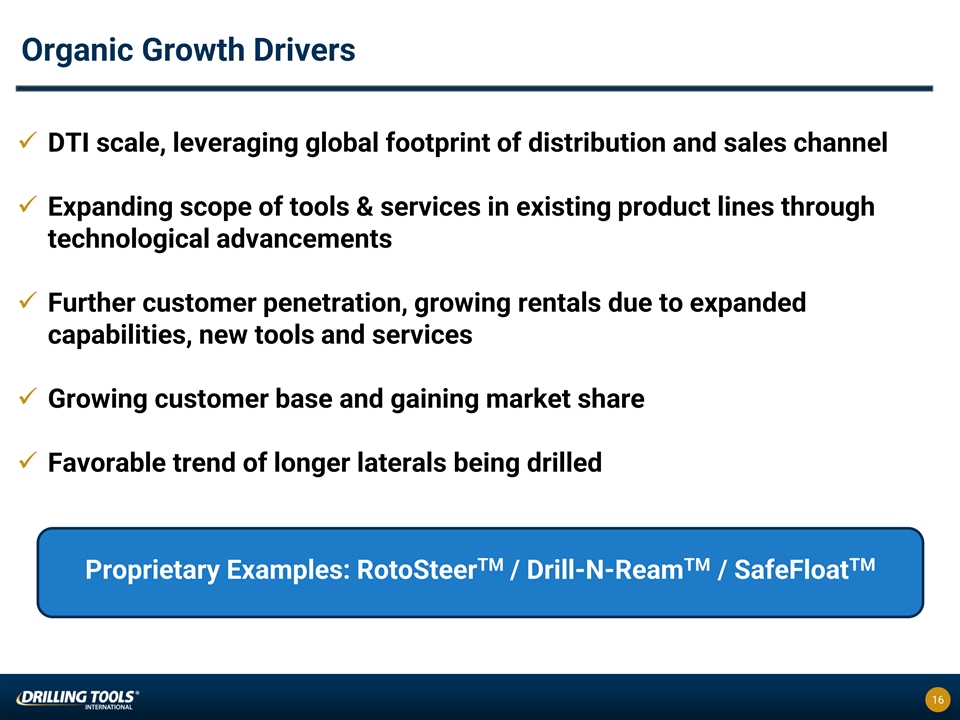 Key Operational Differentiators Modern Manufacturing and Repair Facility ✓ Machine and repair equipment ensures product quality, increases product life and improves fleet utilization ✓ Ability to manufacture most of our rental tools enables cost reduction & control of supply chain Raw Materials From DTI Manufacturing & Tools Added and/or Repair Facilities Mill Returned to Fleet Tools Returned from Rental Proprietary COMPASS* Order Management System ✓ COMPASS provides valuable information to DTI for making data-based capital allocation decisions Unique, Proprietary Software Full Catalog of Tools Expedites Order Process and Support System and Equipment Effective Pricing Controls Transaction Data Analyzed for Customized, Automated, Provides Customers Centralized Strategic Fleet Management Accurate Reporting Order Management 15 * Customer Order Management Portal And Support System