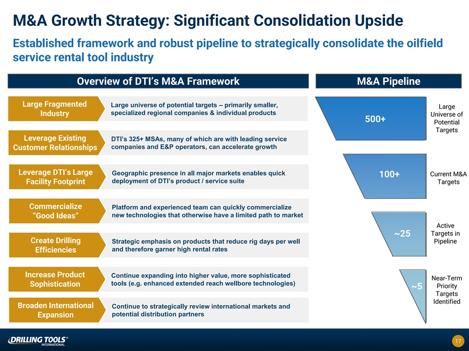 Organic Growth Drivers ✓ DTI scale, leveraging global footprint of distribution and sales channel ✓ Expanding scope of tools & services in existing product lines through technological advancements ✓ Further customer penetration, growing rentals due to expanded capabilities, new tools and services ✓ Growing customer base and gaining market share ✓ Favorable trend of longer laterals being drilled TM TM TM Proprietary Examples: RotoSteer / Drill-N-Ream / SafeFloat 16