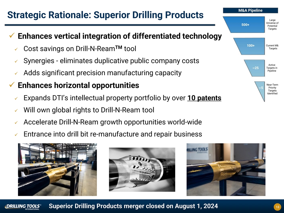 HOUSTON — August 6, 2024 — Drilling Tools International Corp., (NASDAQ: DTI) (“DTI” or the “Company”), a global oilfield services company that designs, engineers, manufactures and provides a differentiated, rental-focused offering of tools for use in onshore and offshore drilling operations, as well as other cutting-edge solutions across the well life cycle, today announced that it has closed on its acquisition of Superior Drilling Products, Inc. (“SDP”) for total consideration paid in cash and DTI stock of approximately $32.2 million per the merger agreement, subject to purchase price accounting adjustments. DTI also reported today its 2024 second quarter results.