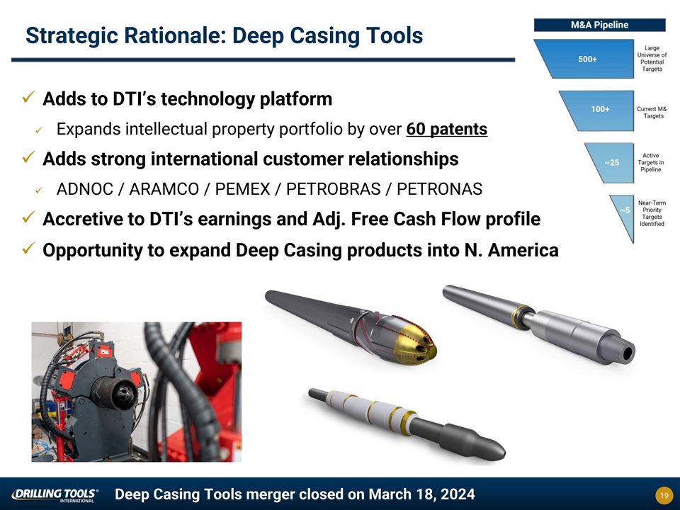 Strategic Rationale: Superior Drilling Products ✓ Enhances vertical integration of differentiated technology TM ✓ Cost savings on Drill-N-Ream tool ✓ Synergies - eliminates duplicative public company costs ✓ Adds significant precision manufacturing capacity ✓ Enhances horizontal opportunities ✓ Expands DTI’s intellectual property portfolio by over 10 patents ✓ Will own global rights to Drill-N-Ream tool ✓ Accelerate Drill-N-Ream growth opportunities world-wide ✓ Entrance into drill bit re-manufacture and repair business Superior Drilling Products merger closed on August 1, 2024 18