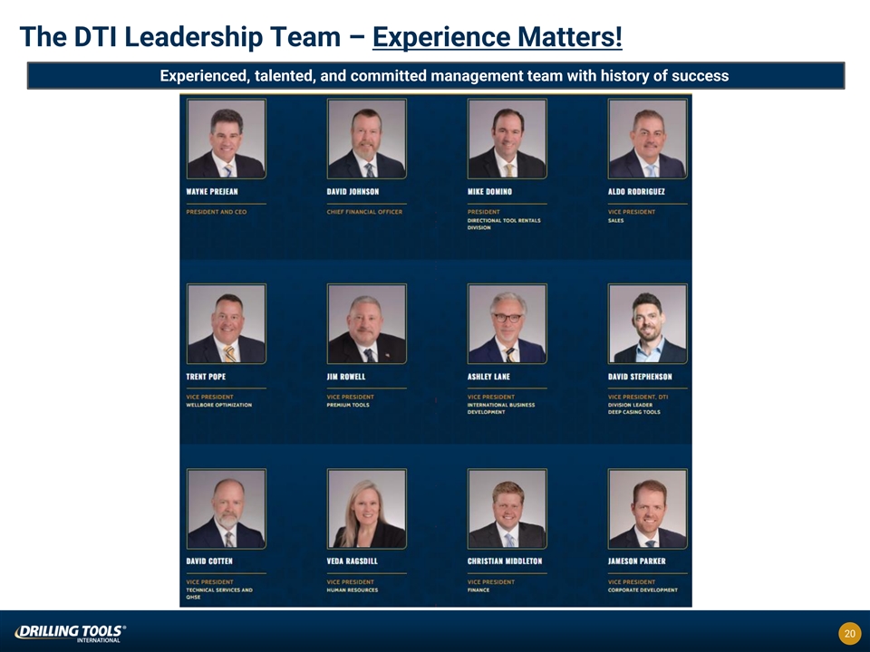 Strategic Rationale: Deep Casing Tools ✓ Adds to DTI’s technology platform ✓ Expands intellectual property portfolio by over 60 patents ✓ Adds strong international customer relationships ✓ ADNOC / ARAMCO / PEMEX / PETROBRAS / PETRONAS ✓ Accretive to DTI’s earnings and Adj. Free Cash Flow profile ✓ Opportunity to expand Deep Casing products into N. America 19 Deep Casing Tools merger closed on March 18, 2024