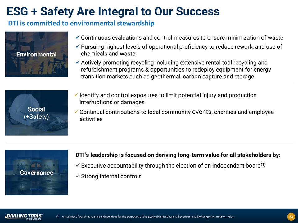 ESG + Safety Are Integral to Our Success DTI is committed to environmental stewardship ✓ Continuous evaluations and control measures to ensure minimization of waste ✓ Pursuing highest levels of operational proficiency to reduce rework, and use of chemicals and waste Environmental ✓ Actively promoting recycling including extensive rental tool recycling and refurbishment programs & opportunities to redeploy equipment for energy transition markets such as geothermal, carbon capture and storage ✓ Identify and control exposures to limit potential injury and production interruptions or damages Social ✓ Continual contributions to local community events, charities and employee (+Safety) activities DTI’s leadership is focused on deriving long-term value for all stakeholders by: (1) ✓ Executive accountability through the election of an independent board Governance ✓ Strong internal controls 1) A majority of our directors are independent for the purposes of the applicable Nasdaq and Securities and Exchange Commission rules. 23