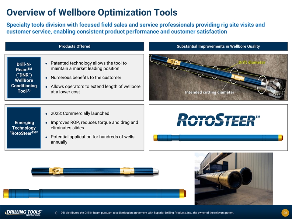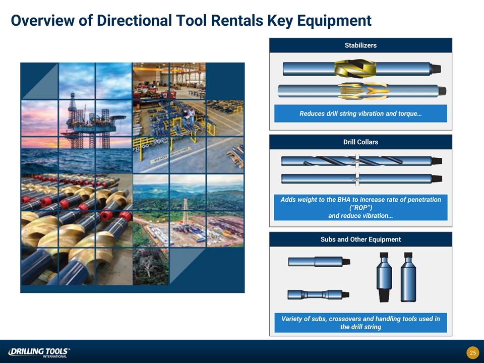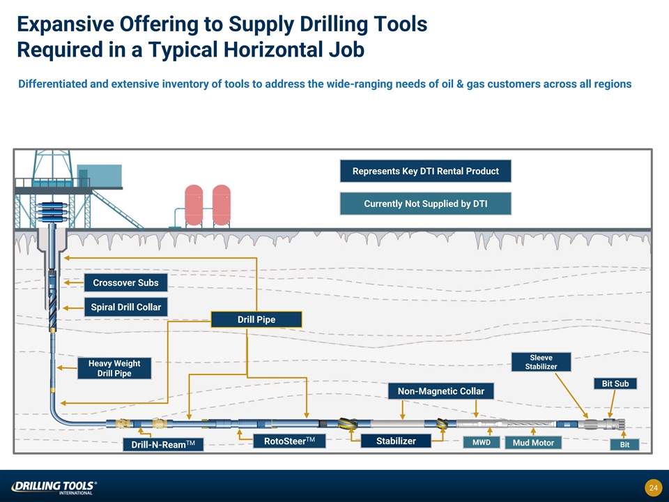 Expansive Offering to Supply Drilling Tools Required in a Typical Horizontal Job Differentiated and extensive inventory of tools to address the wide-ranging needs of oil & gas customers across all regions Represents Key DTI Rental Product Currently Not Supplied by DTI Crossover Subs Spiral Drill Collar Drill Pipe Sleeve Heavy Weight Stabilizer Drill Pipe Bit Sub Non-Magnetic Collar TM RotoSteer Stabilizer TM MWD Mud Motor Bit Drill-N-Ream 24