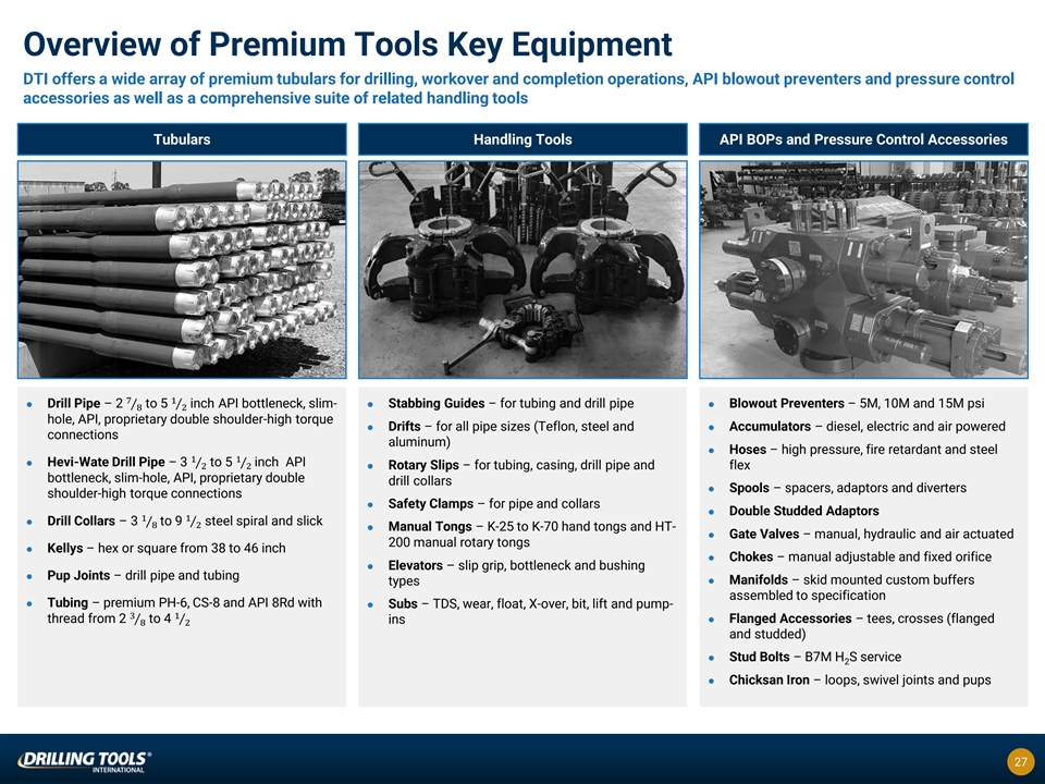 Overview of Premium Tools Key Equipment DTI offers a wide array of premium tubulars for drilling, workover and completion operations, API blowout preventers and pressure control accessories as well as a comprehensive suite of related handling tools Tubulars Handling Tools API BOPs and Pressure Control Accessories 7 1 ⚫ Drill Pipe – 2 Τ to 5 Τ inch API bottleneck, slim-⚫ Stabbing Guides – for tubing and drill pipe⚫ Blowout Preventers – 5M, 10M and 15M psi 8 2 hole, API, proprietary double shoulder-high torque ⚫ Drifts – for all pipe sizes (Teflon, steel and ⚫ Accumulators – diesel, electric and air powered connections aluminum) ⚫ Hoses – high pressure, fire retardant and steel 1 1 Τ Τ ⚫ Hevi-Wate Drill Pipe – 3 to 5 inch API 2 2 ⚫ Rotary Slips – for tubing, casing, drill pipe and flex bottleneck, slim-hole, API, proprietary double drill collars ⚫ Spools – spacers, adaptors and diverters shoulder-high torque connections ⚫ Safety Clamps – for pipe and collars ⚫ Double Studded Adaptors 1 1 ⚫ Drill Collars – 3 Τ to 9 Τ steel spiral and slick 8 2 ⚫ Manual Tongs – K-25 to K-70 hand tongs and HT- ⚫ Gate Valves – manual, hydraulic and air actuated 200 manual rotary tongs ⚫ Kellys – hex or square from 38 to 46 inch ⚫ Chokes – manual adjustable and fixed orifice ⚫ Elevators – slip grip, bottleneck and bushing ⚫ Pup Joints – drill pipe and tubing types⚫ Manifolds – skid mounted custom buffers assembled to specification ⚫ Tubing – premium PH-6, CS-8 and API 8Rd with ⚫ Subs – TDS, wear, float, X-over, bit, lift and pump- 3 1 thread from 2 Τ to 4 Τ ⚫ Flanged Accessories – tees, crosses (flanged ins 8 2 and studded) ⚫ Stud Bolts – B7M H S service 2 ⚫ Chicksan Iron – loops, swivel joints and pups 27