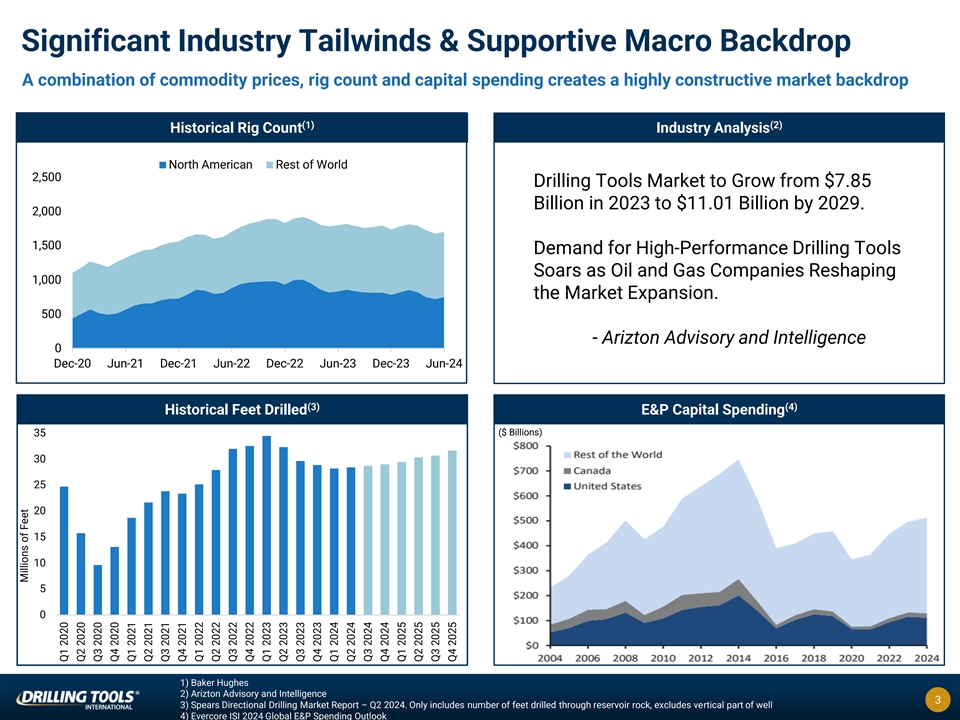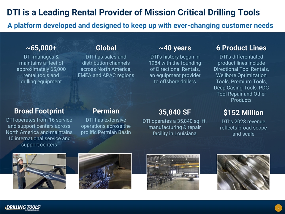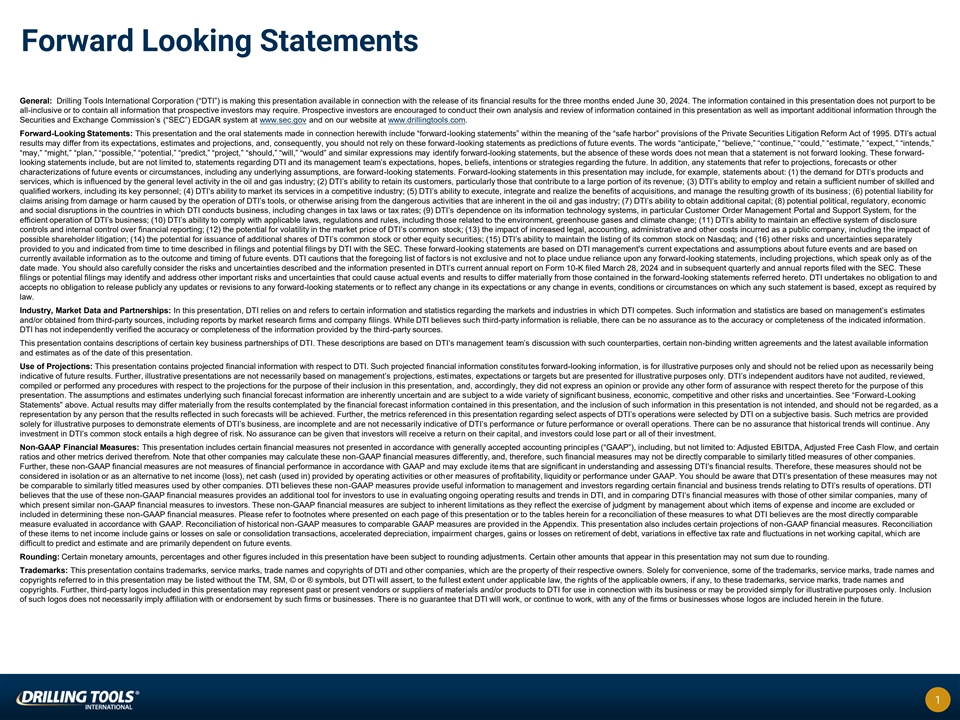 Forward Looking Statements General: Drilling Tools International Corporation (“DTI”) is making this presentation available in connection with the release of its financial results for the three months ended June 30, 2024. The information contained in this presentation does not purport to be all-inclusive or to contain all information that prospective investors may require. Prospective investors are encouraged to conduct their own analysis and review of information contained in this presentation as well as important additional information through the Securities and Exchange Commission’s (“SEC”) EDGAR system at www.sec.gov and on our website at www.drillingtools.com. Forward-Looking Statements: This presentation and the oral statements made in connection herewith include “forward-looking statements” within the meaning of the “safe harbor” provisions of the Private Securities Litigation Reform Act of 1995. DTI’s actual results may differ from its expectations, estimates and projections, and, consequently, you should not rely on these forward-looking statements as predictions of future events. The words “anticipate,” “believe,” “continue,” “could,” “estimate,” “expect,” “intends,” “may,” “might,” “plan,” “possible,” “potential,” “predict,” “project,” “should,” “will,” “would” and similar expressions may identify forward-looking statements, but the absence of these words does not mean that a statement is not forward looking. These forward- looking statements include, but are not limited to, statements regarding DTI and its management team’s expectations, hopes, beliefs, intentions or strategies regarding the future. In addition, any statements that refer to projections, forecasts or other characterizations of future events or circumstances, including any underlying assumptions, are forward-looking statements. Forward-looking statements in this presentation may include, for example, statements about: (1) the demand for DTI’s products and services, which is influenced by the general level activity in the oil and gas industry; (2) DTI’s ability to retain its customers, particularly those that contribute to a large portion of its revenue; (3) DTI’s ability to employ and retain a sufficient number of skilled and qualified workers, including its key personnel; (4) DTI’s ability to market its services in a competitive industry; (5) DTI’s ability to execute, integrate and realize the benefits of acquisitions, and manage the resulting growth of its business; (6) potential liability for claims arising from damage or harm caused by the operation of DTI’s tools, or otherwise arising from the dangerous activities that are inherent in the oil and gas industry; (7) DTI’s ability to obtain additional capital; (8) potential political, regulatory, economic and social disruptions in the countries in which DTI conducts business, including changes in tax laws or tax rates; (9) DTI’s dependence on its information technology systems, in particular Customer Order Management Portal and Support System, for the efficient operation of DTI’s business; (10) DTI’s ability to comply with applicable laws, regulations and rules, including those related to the environment, greenhouse gases and climate change; (11) DTI’s ability to maintain an effective system of disclosure controls and internal control over financial reporting; (12) the potential for volatility in the market price of DTI’s common stock; (13) the impact of increased legal, accounting, administrative and other costs incurred as a public company, including the impact of possible shareholder litigation; (14) the potential for issuance of additional shares of DTI’s common stock or other equity securities; (15) DTI’s ability to maintain the listing of its common stock on Nasdaq; and (16) other risks and uncertainties separately provided to you and indicated from time to time described in filings and potential filings by DTI with the SEC. These forward-looking statements are based on DTI management's current expectations and assumptions about future events and are based on currently available information as to the outcome and timing of future events. DTI cautions that the foregoing list of factors is not exclusive and not to place undue reliance upon any forward-looking statements, including projections, which speak only as of the date made. You should also carefully consider the risks and uncertainties described and the information presented in DTI’s current annual report on Form 10-K filed March 28, 2024 and in subsequent quarterly and annual reports filed with the SEC. These filings or potential filings may identify and address other important risks and uncertainties that could cause actual events and results to differ materially from those contained in the forward-looking statements referred hereto. DTI undertakes no obligation to and accepts no obligation to release publicly any updates or revisions to any forward-looking statements or to reflect any change in its expectations or any change in events, conditions or circumstances on which any such statement is based, except as required by law. Industry, Market Data and Partnerships: In this presentation, DTI relies on and refers to certain information and statistics regarding the markets and industries in which DTI competes. Such information and statistics are based on management’s estimates and/or obtained from third-party sources, including reports by market research firms and company filings. While DTI believes such third-party information is reliable, there can be no assurance as to the accuracy or completeness of the indicated information. DTI has not independently verified the accuracy or completeness of the information provided by the third-party sources. This presentation contains descriptions of certain key business partnerships of DTI. These descriptions are based on DTI’s managemen