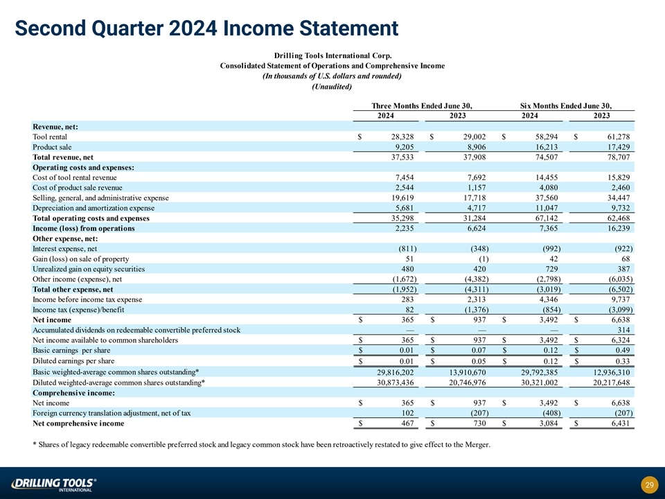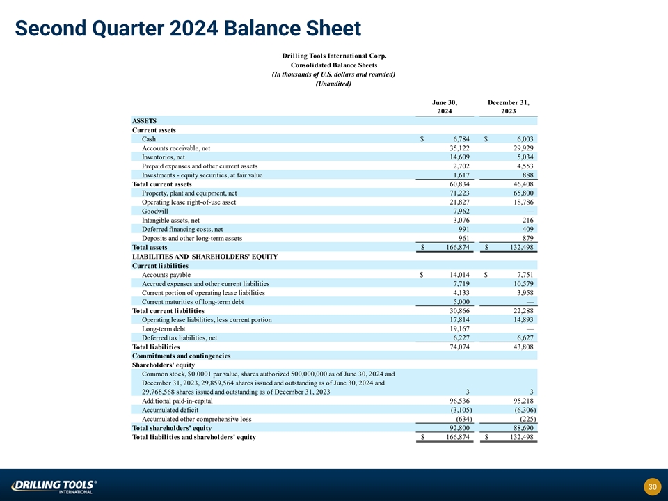Second Quarter 2024 Income Statement Drilling Tools International Corp. Consolidated Statement of Operations and Comprehensive Income (In thousands of U.S. dollars and rounded) (Unaudited) Three Months Ended June 30, Six Months Ended June 30, 2024 2023 2024 2023 Revenue, net: Tool rental $ 28,328 $ 2 9,002 $ 58,294 $ 61,278 Product sale 9 ,205 8,906 16,213 17,429 Total revenue, net 37,533 3 7,908 7 4,507 7 8,707 Operating costs and expenses: Cost of tool rental revenue 7,454 7,692 1 4,455 15,829 Cost of product sale revenue 2 ,544 1,157 4,080 2,460 Selling, general, and administrative expense 1 9,619 17,718 3 7,560 34,447 Depreciation and amortization expense 5 ,681 4,717 11,047 9,732 Total operating costs and expenses 35,298 3 1,284 67,142 6 2,468 Income (loss) from operations 2 ,235 6,624 7,365 16,239 Other expense, net: Interest expense, net ( 811) (348) (992) (922) Gain (loss) on sale of property 51 (1) 42 68 Unrealized gain on equity securities 480 420 729 387 Other income (expense), net (1,672) (4,382) (2,798) (6,035) Total other expense, net (1,952) (4,311) (3,019) ( 6,502) Income before income tax expense 283 2 ,313 4 ,346 9 ,737 Income tax (expense)/benefit 82 (1,376) ( 854) (3,099) Net income $ 365 $ 937 $ 3,492 $ 6,638 Accumulated dividends on redeemable convertible preferred stock — — — 314 Net income available to common shareholders $ 365 $ 937 $ 3 ,492 $ 6,324 Basic earnings per share $ 0.01 $ 0.07 $ 0.12 $ 0.49 Diluted earnings per share $ 0.01 $ 0.05 $ 0.12 $ 0 .33 Basic weighted-average common shares outstanding* 2 9,816,202 13,910,670 2 9,792,385 12,936,310 Diluted weighted-average common shares outstanding* 30,873,436 20,746,976 30,321,002 20,217,648 Comprehensive income: Net income $ 365 $ 937 $ 3 ,492 $ 6 ,638 Foreign currency translation adjustment, net of tax 102 ( 207) (408) ( 207) Net comprehensive income $ 467 $ 730 $ 3 ,084 $ 6,431 * Shares of legacy redeemable convertible preferred stock and legacy common stock have been retroactively restated to give effect to the Merger. 29