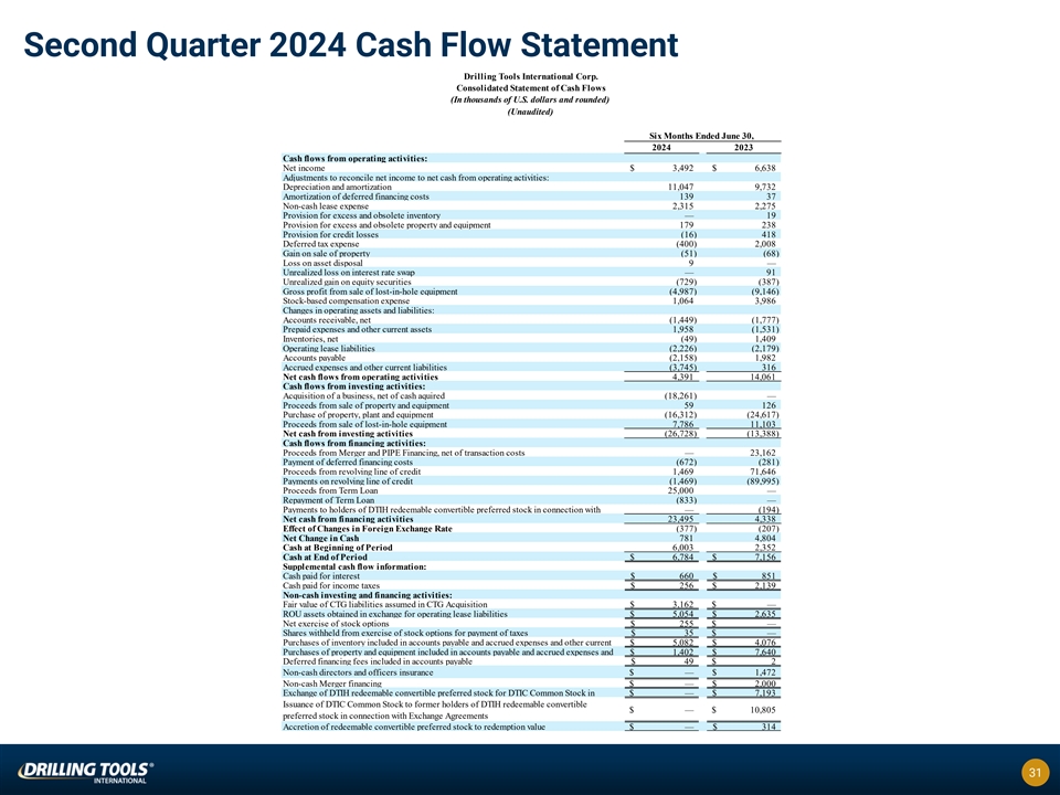 Second Quarter 2024 Cash Flow Statement Drilling Tools International Corp. Consolidated Statement of Cash Flows (In thousands of U.S. dollars and rounded) (Unaudited) Six Months Ended June 30, 2024 2023 Cash flows from operating activities: Net income $ 3,492 $ 6 ,638 Adjustments to reconcile net income to net cash from operating activities: Depreciation and amortization 11,047 9 ,732 Amortization of deferred financing costs 139 37 Non-cash lease expense 2,315 2,275 Provision for excess and obsolete inventory — 19 Provision for excess and obsolete property and equipment 179 238 Provision for credit losses (16) 418 Deferred tax expense (400) 2 ,008 Gain on sale of property (51) ( 68) Loss on asset disposal 9 — Unrealized loss on interest rate swap — 91 Unrealized gain on equity securities (729) ( 387) Gross profit from sale of lost-in-hole equipment (4,987) (9,146) Stock-based compensation expense 1,064 3,986 Changes in operating assets and liabilities: Accounts receivable, net (1,449) ( 1,777) Prepaid expenses and other current assets 1,958 ( 1,531) Inventories, net (49) 1,409 Operating lease liabilities (2,226) (2,179) Accounts payable (2,158) 1,982 Accrued expenses and other current liabilities (3,745) 316 Net cash flows from operating activities 4,391 1 4,061 Cash flows from investing activities: Acquisition of a business, net of cash aquired (18,261) — Proceeds from sale of property and equipment 59 126 Purchase of property, plant and equipment (16,312) (24,617) Proceeds from sale of lost-in-hole equipment 7,786 11,103 Net cash from investing activities ( 26,728) ( 13,388) Cash flows from financing activities: Proceeds from Merger and PIPE Financing, net of transaction costs — 23,162 Payment of deferred financing costs (672) (281) Proceeds from revolving line of credit 1 ,469 7 1,646 Payments on revolving line of credit ( 1,469) (89,995) Proceeds from Term Loan 25,000 — Repayment of Term Loan (833) — Payments to holders of DTIH redeemable convertible preferred stock in connection with — ( 194) Net cash from financing activities 2 3,495 4,338 Effect of Changes in Foreign Exchange Rate ( 377) (207) Net Change in Cash 781 4 ,804 Cash at Beginning of Period 6,003 2,352 Cash at End of Period $ 6,784 $ 7,156 Supplemental cash flow information: Cash paid for interest $ 660 $ 851 Cash paid for income taxes $ 256 $ 2,139 Non-cash investing and financing activities: Fair value of CTG liabilities assumed in CTG Acquisition $ 3,162 $ — ROU assets obtained in exchange for operating lease liabilities $ 5 ,054 $ 2 ,635 Net exercise of stock options $ 255 $ — Shares withheld from exercise of stock options for payment of taxes $ 35 $ — Purchases of inventory included in accounts payable and accrued expenses and other current $ 5 ,082 $ 4,076 Purchases of property and equipment included in accounts payable and accrued expenses and $ 1,402 $ 7 ,640 Deferred financing fees included in accounts payable $ 49 $ 2 Non-cash directors and officers insurance $ — $ 1 ,472 Non-cash Merger financing $ — $ 2 ,000 Exchange of DTIH redeemable convertible preferred stock for DTIC Common Stock in $ — $ 7 ,193 Issuance of DTIC Common Stock to former holders of DTIH redeemable convertible $ — $ 10,805 preferred stock in connection with Exchange Agreements Accretion of redeemable convertible preferred stock to redemption value $ — $ 314 31