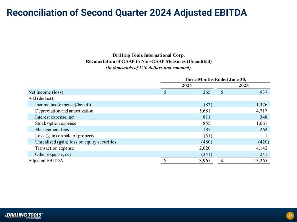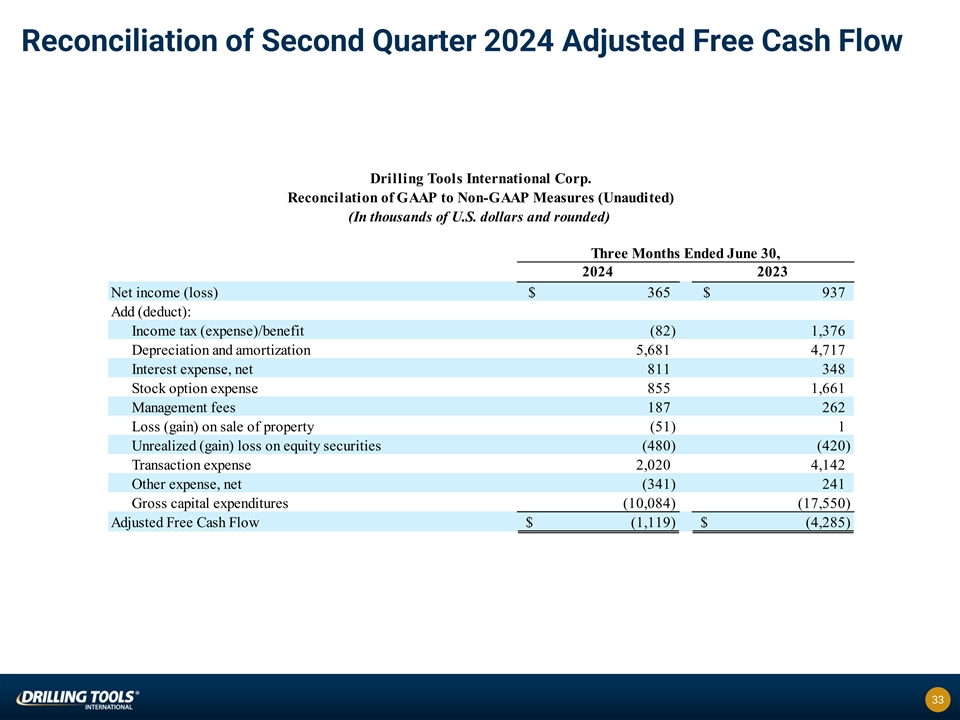 Reconciliation of Second Quarter 2024 Adjusted EBITDA Drilling Tools International Corp. Reconcilation of GAAP to Non-GAAP Measures (Unaudited) (In thousands of U.S. dollars and rounded) Three Months Ended June 30, 2024 2023 Net income (loss) $ 365 $ 937 Add (deduct): Income tax (expense)/benefit (82) 1,376 Depreciation and amortization 5,681 4,717 Interest expense, net 811 348 Stock option expense 855 1,661 Management fees 187 262 Loss (gain) on sale of property (51) 1 Unrealized (gain) loss on equity securities (480) (420) Transaction expense 2,020 4,142 Other expense, net ( 341) 241 Adjusted EBITDA $ 8,965 $ 1 3,265 32