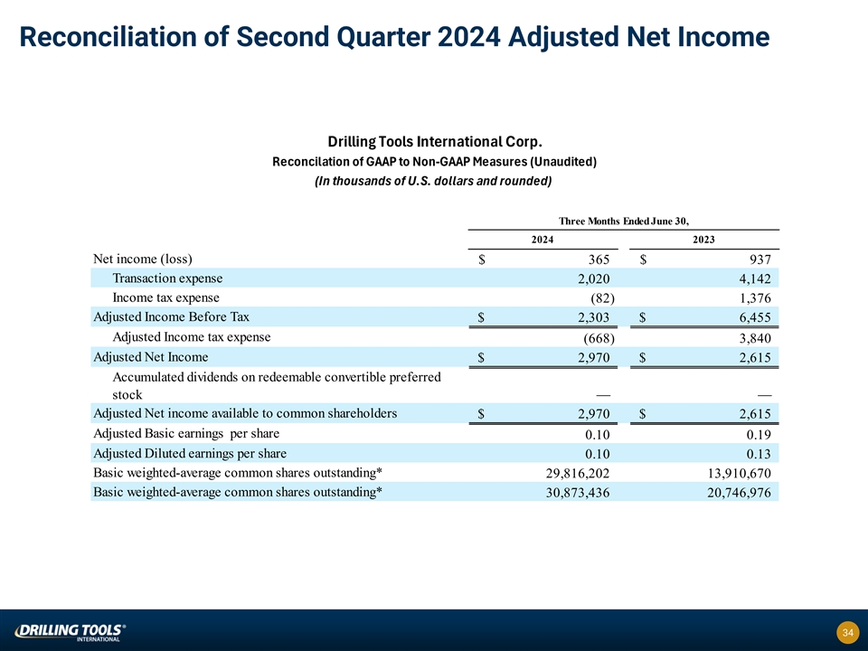 Reconciliation of Second Quarter 2024 Adjusted Free Cash Flow Drilling Tools International Corp. Reconcilation of GAAP to Non-GAAP Measures (Unaudited) (In thousands of U.S. dollars and rounded) Three Months Ended June 30, 2024 2023 Net income (loss) $ 365 $ 937 Add (deduct): Income tax (expense)/benefit (82) 1,376 Depreciation and amortization 5 ,681 4,717 Interest expense, net 811 348 Stock option expense 855 1,661 Management fees 187 262 Loss (gain) on sale of property (51) 1 Unrealized (gain) loss on equity securities ( 480) (420) Transaction expense 2,020 4,142 Other expense, net (341) 241 Gross capital expenditures (10,084) (17,550) Adjusted Free Cash Flow $ ( 1,119) $ (4,285) 33