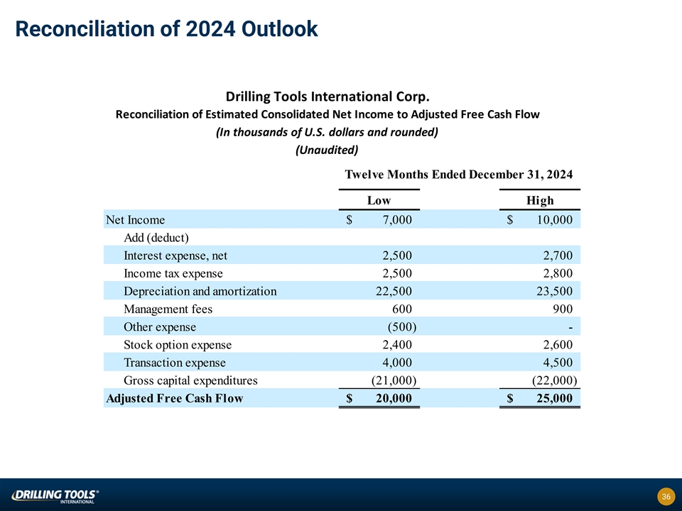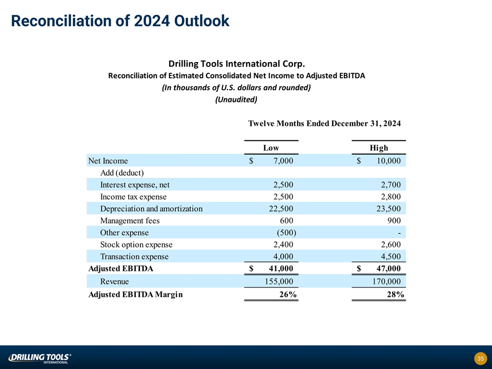 Reconciliation of 2024 Outlook Drilling Tools International Corp. Reconciliation of Estimated Consolidated Net Income to Adjusted EBITDA (In thousands of U.S. dollars and rounded) (Unaudited) Twelve Months Ended December 31, 2024 Low High Net Income $ 7 ,000 $ 10,000 Add (deduct) Interest expense, net 2,500 2,700 Income tax expense 2,500 2,800 Depreciation and amortization 2 2,500 23,500 Management fees 600 900 Other expense (500) - Stock option expense 2,400 2,600 Transaction expense 4,000 4,500 Adjusted EBITDA $ 41,000 $ 47,000 Revenue 155,000 170,000 Adjusted EBITDA Margin 26% 28% 35