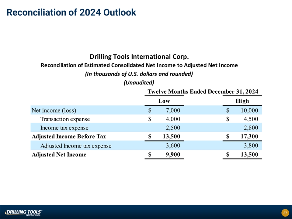 Reconciliation of 2024 Outlook Drilling Tools International Corp. Reconciliation of Estimated Consolidated Net Income to Adjusted Free Cash Flow (In thousands of U.S. dollars and rounded) (Unaudited) Twelve Months Ended December 31, 2024 Low High Net Income $ 7,000 $ 10,000 Add (deduct) Interest expense, net 2,500 2,700 Income tax expense 2,500 2,800 Depreciation and amortization 2 2,500 23,500 Management fees 600 900 Other expense ( 500) - Stock option expense 2,400 2,600 Transaction expense 4,000 4,500 Gross capital expenditures (21,000) (22,000) Adjusted Free Cash Flow $ 20,000 $ 25,000 36