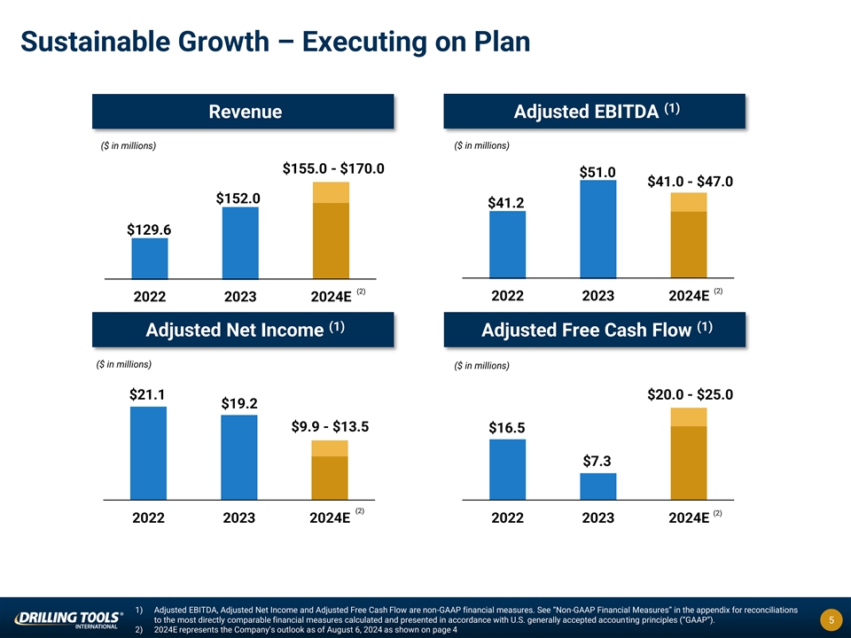 2024 Financial Outlook Delivering Adjusted Free Cash Flow Throughout The Cycle DTI continues to execute its M&A strategy with ~5 near-term priority targets identified ✓ DTI expects continued declines in the North American rig count throughout 2024, after a 20% decline in 2023 ✓ FY 2024 guidance includes estimated contributions from Deep Casing Tools and Superior Drilling Products Key Guidance Summary FY 2024 Guidance ($ thousands) Revenue $155,000 - $170,000 (1) Adjusted EBITDA $41,000 - $47,000 (1) Adjusted Net Income $9,900 - $13,500 (1)(2) Adjusted Free Cash Flow $20,000 - $25,000 1) Adjusted EBITDA, Adjusted Net Income and Adjusted Free Cash Flow are non-GAAP financial measures. See “Non-GAAP Financial Measures” in the appendix for reconciliations to the most directly comparable financial measures calculated and presented in accordance with U.S. generally accepted accounting principles (“GAAP”). 4 2) Adjusted Free Cash Flow defined as Adjusted EBITDA less Gross Capital Expenditures