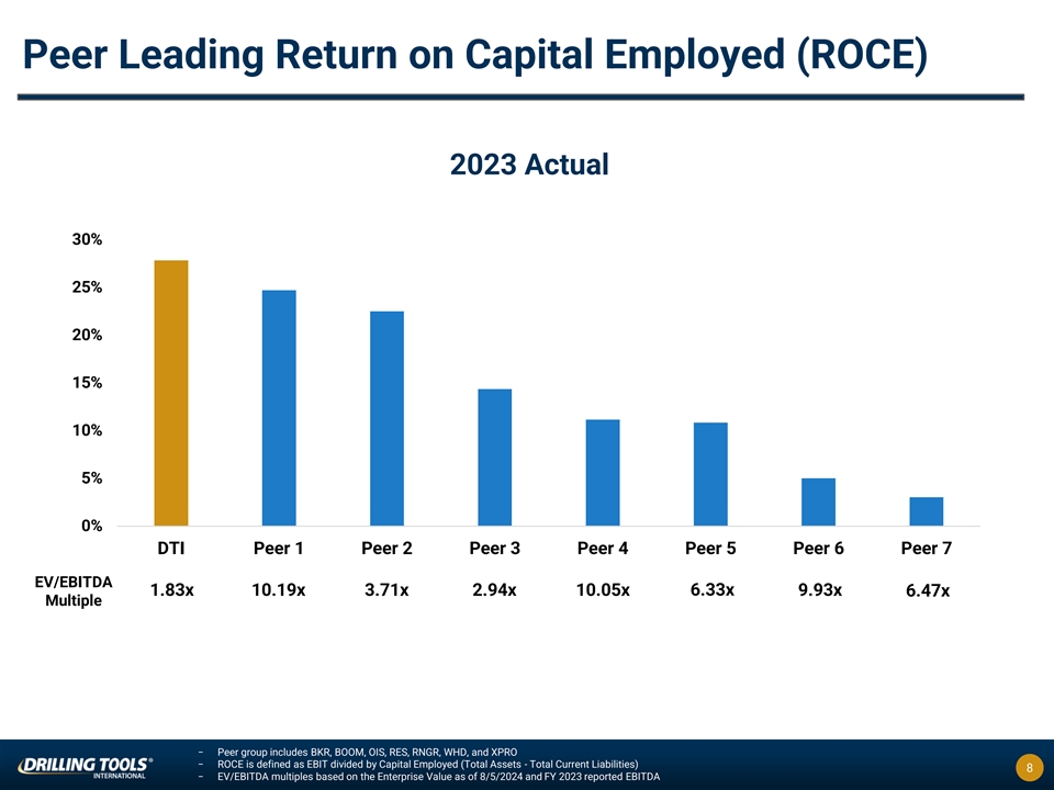 (1) Peer Adj. Free Cash Flow Margin Comparisons (2) 2023 Actual 2024 Estimates 35% 35% 30% 30% 25% 25% 20% 20% 15% 15% 10% 10% 5% 5% 0% 0% Peer 1 Peer 2 Peer 3 Peer 4 Peer 5 Peer 6 Peer 7 DTI Peer 1 DTI Peer 2 Peer 3 Peer 4 Peer 5 Peer 6 Peer 7 Tool recovery revenue, also known as lost or damaged equipment charges, allows DTI to sustain its fleet, maintain relevant tools and technology, and generate positive adjusted free cash flow throughout industry cycles. Peer group includes BKR, BOOM, OIS, RES, RNGR, WHD, and XPRO 1) Adjusted Free Cash Flow Margin is defined as Adjusted EBITDA less Gross Capital Expenditures divided by Total Revenue 7 2) Uses midpoint of DTI's 2024 guidance and FY24 consensus estimates for peer group