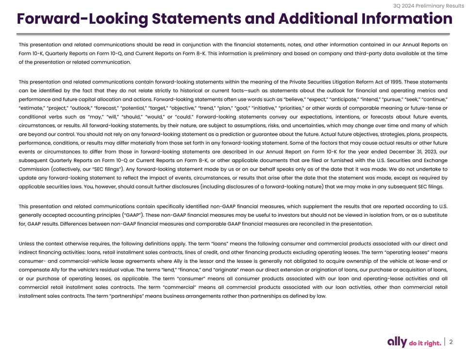 2024年10月18日、アリー・ファイナンシャル・インクは2024年9月30日に終了した第3四半期の営業成績速報を発表するプレスリリースを発表した。このプレスリリースはここに添付され、参照により別紙99.1として組み込まれる。証券アナリストに提供された図表は本書に添付され、参照することにより別紙99.2として組み込まれる。また、証券アナリストに提出した補足財務データは本書に添付され、参照することにより別紙99.3として組み込まれる。