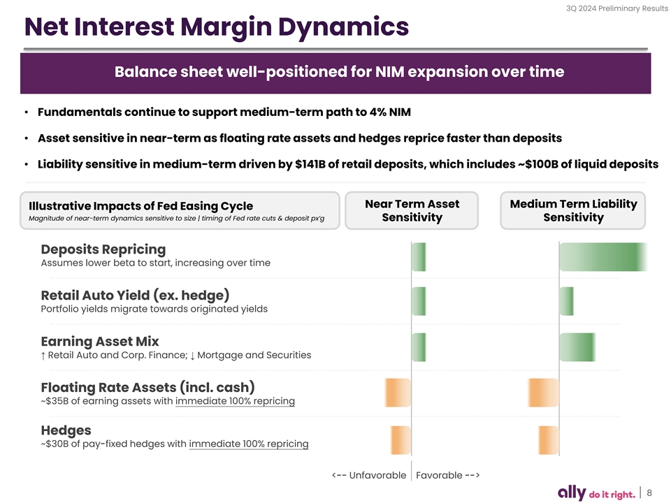 アリー銀行では、1,410 億米ドルのリテール預金の 92%が FDIC に保証されています。より良い銀行を作るという私たちのコミットメントは、リテール預金の顧客数が62四半期連続で増加し、現在では330万人に達していることからも明らかです。預金は引き続き強みの源泉であり、当行の負債に配慮したバランスシートは、中期的な利ざや拡大にとって有利なポジションにあります。