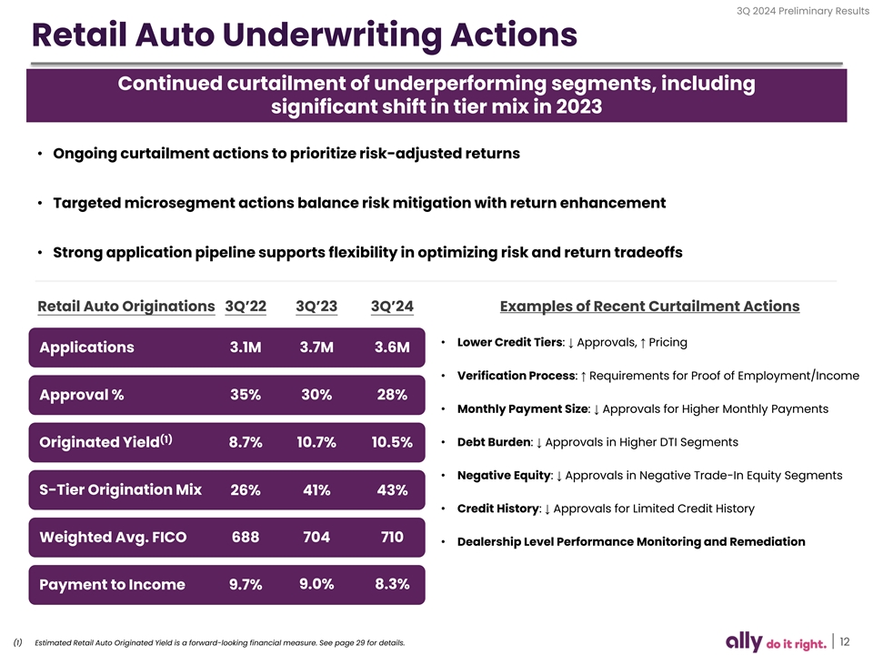 自動車保険では、2万2,000 のディーラーからなる強固なネットワークにより、360 万件の消費者申込みを決定し、94 億ドルの消費者向け自動車ローンの組成を強力なリスク調整後利回りで実現した。リテール・オートの正味償却率は2.24%と高水準ですが、私たちが実施した削減措置により、時間の経過とともに損失は減少していくと確信しています。また、記録的な収入保険料3億8,400 万ドルは、保険事業の継続的な勢いを反映しています。