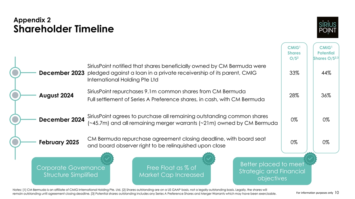 Appendix 2 Shareholder Timeline 1 1 CMIG CMIG Shares Potential 2 2,3 O/S Shares O/S SiriusPoint notified that shares beneficially owned by CM Bermuda were December 2023 pledged against a loan in a private receivership of its parent, CMIG 33% 44% International Holding Pte Ltd SiriusPoint repurchases 9.1m common shares from CM Bermuda 28% 36% August 2024 Full settlement of Series A Preference shares, in cash, with CM Bermuda SiriusPoint agrees to purchase all remaining outstanding common shares December 2024 0% 0% (~45.7m) and all remaining merger warrants (~21m) owned by CM Bermuda CM Bermuda repurchase agreement closing deadline, with board seat 0% 0% February 2025 and board observer right to be relinquished upon close Better placed to meet Corporate Governance Free Float as % of Strategic and Financial Structure Simplified Market Cap Increased objectives Notes: [1] CM Bermuda is an affiliate of CMIG International Holding Pte. Ltd. [2] Shares outstanding are on a US GAAP basis, not a legally outstanding basis. Legally, the shares will For information purposes only 10 remain outstanding until agreement closing deadline. [3] Potential shares outstanding includes any Series A Preference Shares and Merger Warrants which may have been exercisable.
