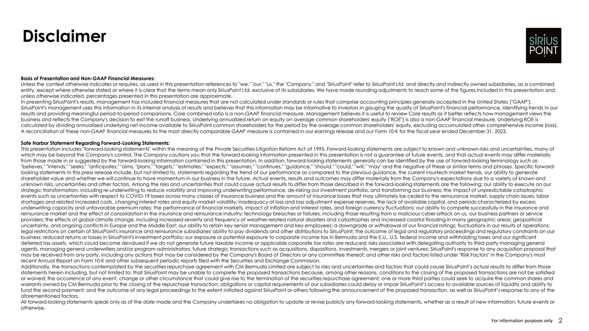 Disclaimer Basis of Presentation and Non-GAAP Financial Measures: Unless the context otherwise indicates or requires, as used in this presentation references to we, our, us, the Company, and SiriusPoint refer to SiriusPoint Ltd. and directly and indirectly owned subsidiaries, as a combined entity, except where otherwise stated or where it is clear that the terms mean only SiriusPoint Ltd. exclusive of its subsidiaries. We have made rounding adjustments to reach some of the figures included in this presentation and, unless otherwise indicated, percentages presented in this presentation are approximate. In presenting SiriusPoint's results, management has included financial measures that are not calculated under standards or rules that comprise accounting principles generally accepted in the United States ( GAAP ). SiriusPoint's management uses this information in its internal analysis of results and believes that this information may be informative to investors in gauging the quality of SiriusPoint's financial performance, identifying trends in our results and providing meaningful period-to-period comparisons. Core combined ratio is a non-GAAP financial measure. Management believes it is useful to review Core results as it better reflects how management views the business and reflects the Company's decision to exit the runoff business. Underlying annualized return on equity on average common shareholders' equity ( ROE ) is also a non-GAAP financial measure. Underlying ROE is calculated by dividing annualized underlying net income available to SiriusPoint common shareholders for the period by the average common shareholders' equity, excluding accumulated other comprehensive income (loss). A reconciliation of these non-GAAP financial measures to the most directly comparable GAAP measure is contained in our earnings release and our Form 10-K for the fiscal year ended December 31, 2023. Safe Harbor Statement Regarding Forward-Looking Statements: This presentation includes forward-looking statements within the meaning of the Private Securities Litigation Reform Act of 1995. Forward-looking statements are subject to known and unknown risks and uncertainties, many of which may be beyond the Company's control. The Company cautions you that the forward-looking information presented in this presentation is not a guarantee of future events, and that actual events may differ materially from those made in or suggested by the forward-looking information contained in this presentation. In addition, forward-looking statements generally can be identified by the use of forward-looking terminology such as believes, intends, seeks, anticipates, aims, plans, targets, estimates, expects, assumes, continues, guidance, should, could, will, may and the negative of these or similar terms and phrases. Specific forward- looking statements in this press release include, but not limited to, statements regarding the trend of our performance as compared to the previous guidance, the current insurtech market trends, our ability to generate shareholder value and whether we will continue to have momentum in our business in the future. Actual events, results and outcomes may differ materially from the Company's expectations due to a variety of known and unknown risks, uncertainties and other factors. Among the risks and uncertainties that could cause actual results to differ from those described in the forward-looking statements are the following: our ability to execute on our strategic transformation, including re-underwriting to reduce volatility and improving underwriting performance, de-risking our investment portfolio, and transforming our business; the impact of unpredictable catastrophic events such as uncertainties with respect to COVID-19 losses across many classes of insurance business and the amount of insurance losses that may ultimately be ceded to the reinsurance market, supply chain issues, labor shortages and related increased costs, changing interest rates and equity market volatility; inadequacy of loss and loss adjustment expense reserves, the lack of available capital, and periods characterized by excess underwriting capacity and unfavorable premium rates; the performance of financial markets, impact of inflation and interest rates, and foreign currency fluctuations; our ability to compete successfully in the insurance and reinsurance market and the effect of consolidation in the insurance and reinsurance industry; technology breaches or failures, including those resulting from a malicious cyber-attack on us, our business partners or service providers; the effects of global climate change, including increased severity and frequency of weather-related natural disasters and catastrophes and increased coastal flooding in many geographic areas; geopolitical uncertainty, and ongoing conflicts in Europe and the Middle East; our ability to retain key senior management and key employees; a downgrade or withdrawal of our financial ratings; fluctuations in our results of operations; legal restrictions on certain of SiriusPoint's insurance and reinsurance subsidiaries' ability to pay dividends and other distributions to SiriusPoint; the outcome of legal and regulatory proceedings and regulatory constraints on our business; reduced returns or losses in SiriusPoint's investment portfolio; our exposure or potential exposure to corporate income tax in Bermuda and the E.U., U.S. federal income and withholding taxes and our significant deferred tax assets, which could become devalued if we do not generate future taxable income or applicable corporate tax rates are reduced; risks associated with delegating authority to third party managing general agents, managing general underwriters and/or program administrators; future strategic transactions such as acquisitions, dispositions, investments, mergers or joint ventures; SiriusPoint's response to any acquisition proposal that may be received from any party, including any act