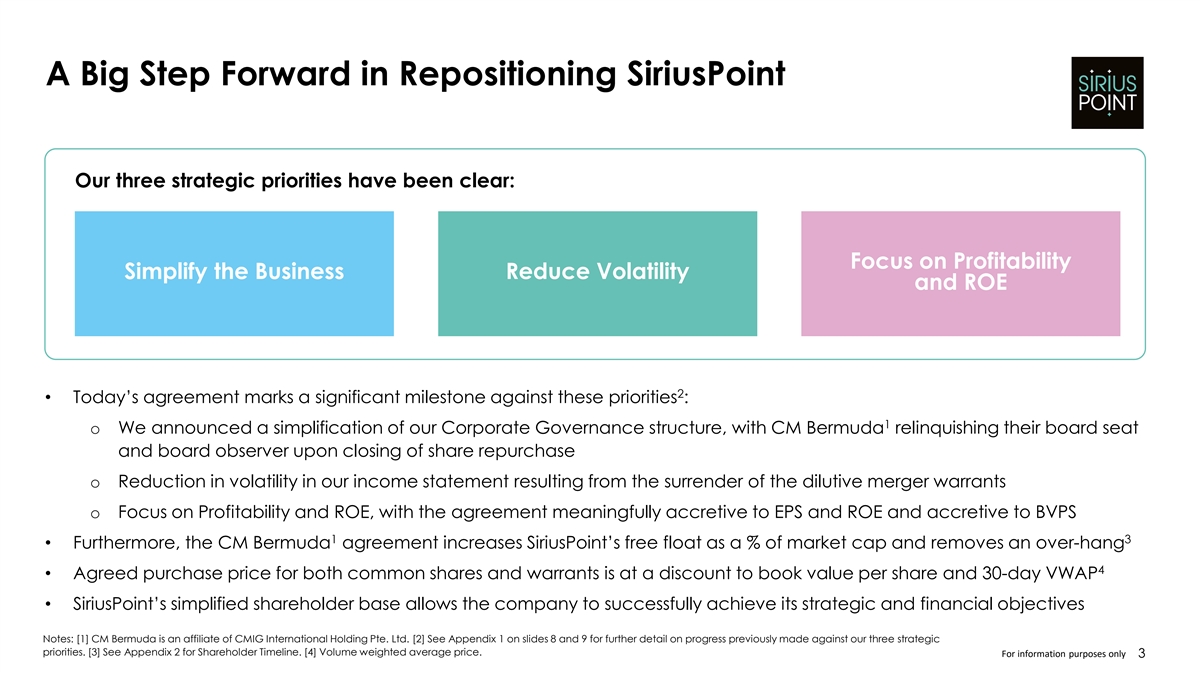 A Big Step Forward in Repositioning SiriusPoint Our three strategic priorities have been clear: Focus on Profitability Simplify the Business Reduce Volatility and ROE 2 • Today’s agreement marks a significant milestone against these priorities : 1 o We announced a simplification of our Corporate Governance structure, with CM Bermuda relinquishing their board seat and board observer upon closing of share repurchase o Reduction in volatility in our income statement resulting from the surrender of the dilutive merger warrants o Focus on Profitability and ROE, with the agreement meaningfully accretive to EPS and ROE and accretive to BVPS 1 3 • Furthermore, the CM Bermuda agreement increases SiriusPoint’s free float as a % of market cap and removes an over-hang 4 • Agreed purchase price for both common shares and warrants is at a discount to book value per share and 30-day VWAP • SiriusPoint’s simplified shareholder base allows the company to successfully achieve its strategic and financial objectives Notes: [1] CM Bermuda is an affiliate of CMIG International Holding Pte. Ltd. [2] See Appendix 1 on slides 8 and 9 for further detail on progress previously made against our three strategic priorities. [3] See Appendix 2 for Shareholder Timeline. [4] Volume weighted average price. For information purposes only 3