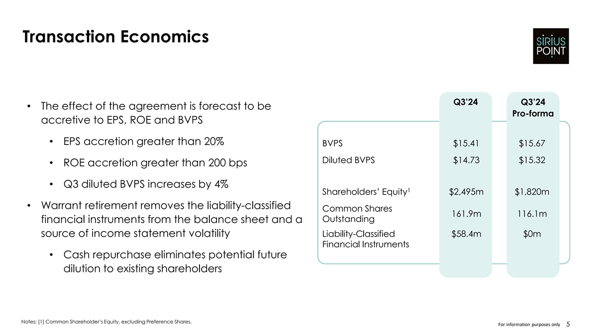 CM Bermuda Agreement Summary 1 Key Takeaways • Full repurchase of all CM Bermuda common shares and outstanding warrants for $733m agreed Buyback agreed for • 45.7m shares repurchased at $14.25, represents a 6% 2 45.7m outstanding shares discount to 30-day VWAP (28.2% of shares outstanding) • 21.0m warrants surrendered, with proceeds of $3.56 per warrant ($11.00 strike price) • First payment of $250m paid December 30, 2024. Final 21.0m of dilutive merger payment of $483m to be paid on or before February 28, 2025 warrants surrendered and retired • Shares will remain legally outstanding until final payment, but under US GAAP rules they will no longer be 3 considered outstanding as of December 30, 2024 • Deal to be financed through existing excess capital, no Agreement is accretive to increase in debt issuance Q3’24 EPS, ROE and BVPS • BSCR and debt-to-capital levels remain within target ranges Notes: [1] CM Bermuda is an affiliate of CMIG International Holding Pte. Ltd. [2] Volume weighted average price as of 12/27/24. [3] December 31, 2024 GAAP balance sheet will reflect fully reduced Shareholders’ Equity and shares outstanding. For information purposes only 4