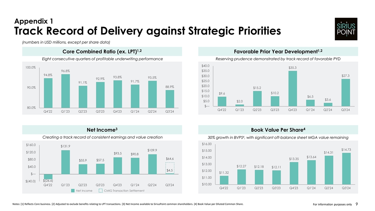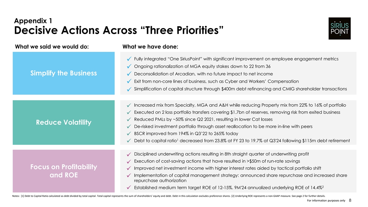 Appendix 1 Decisive Actions Across “Three Priorities” What we said we would do: What we have done: Fully integrated “One SiriusPoint” with significant improvement on employee engagement metrics Ongoing rationalization of MGA equity stakes down to 22 from 36 Simplify the Business Deconsolidation of Arcadian, with no future impact to net income Exit from non-core lines of business, such as Cyber and Workers’ Compensation Simplification of capital structure through $400m debt refinancing and CMIG shareholder transactions Increased mix from Specialty, MGA and A&H while reducing Property mix from 22% to 16% of portfolio Executed on 2 loss portfolio transfers covering $1.7bn of reserves, removing risk from exited business Reduced PMLs by ~50% since Q2 2021, resulting in lower Cat losses Reduce Volatility De-risked investment portfolio through asset reallocation to be more in-line with peers BSCR improved from 194% in Q3’22 to 265% today 1 Debt to capital ratio decreased from 23.8% at FY 23 to 19.7% at Q3'24 following $115m debt retirement Disciplined underwriting actions resulting in 8th straight quarter of underwriting profit Execution of cost-saving actions that have resulted in >$50m of run-rate savings Focus on Profitability Improved net investment income with higher interest rates aided by tactical portfolio shift Implementation of capital management strategy: announced share repurchase and increased share and ROE repurchase authorization 2 Established medium term target ROE of 12-15%. 9M'24 annualized underlying ROE of 14.4% Notes: [1] Debt to Capital Ratio calculated as debt divided by total capital. Total capital represents the sum of shareholders' equity and debt. Debt in this calculation excludes preference shares. [2] Underlying ROE represents a non-GAAP measure. See page 2 for further details. For information purposes only 8