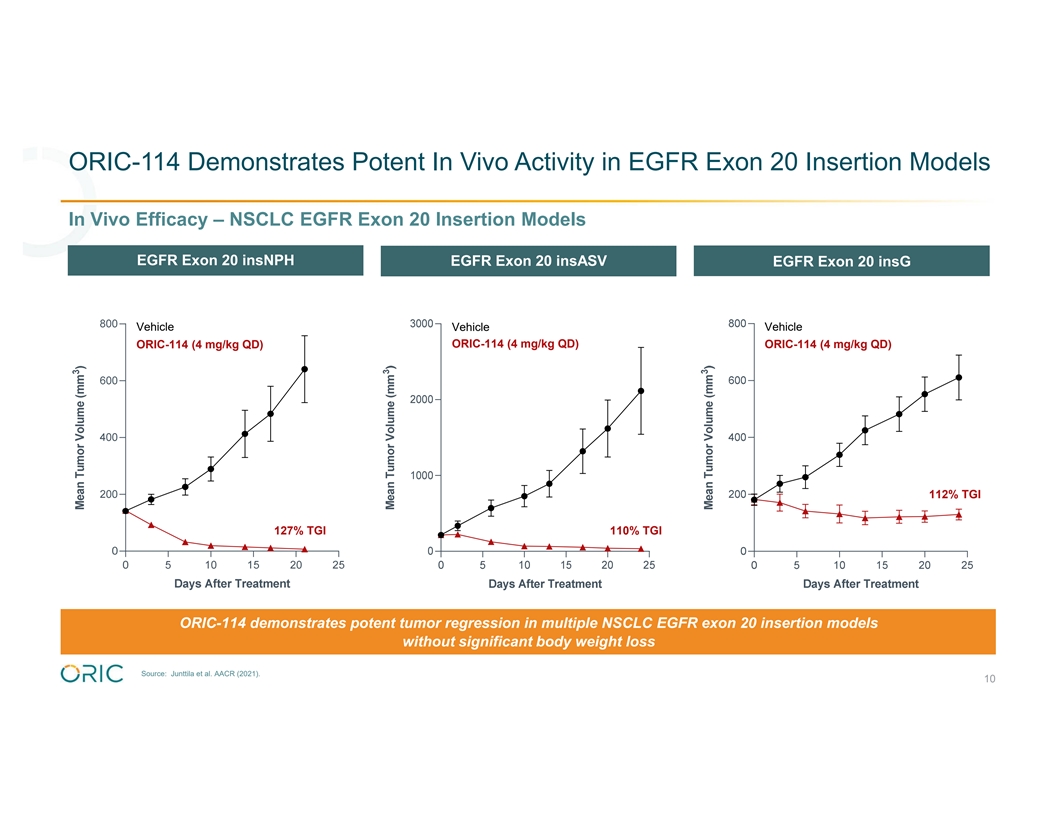 ORIC-114 Selectively Targets EGFR and HER2 with High Potency Against EGFR Exon 20 Insertion, HER2 Exon 20 Insertion and EGFR Atypical Mutations Kinome Selectivity Comparison ORIC-114 Firmonertinib Zipalertinib Lazertinib BDTX-1535 Off-target Kinases Inhibited ≥80% at 1mM ORIC-114 Firmonertinib Zipalertinib Lazertinib BDTX-1535 0 4 7 14 25 ORIC-114 has demonstrated an exquisitely clean kinome panel, mitigating the potential for off-target toxicities Source: Junttila et al. ESMO (2023) and ORIC data on file. Note: Kinase binding profiles across 468 kinases at 1 μM assessed using KINOMEscan. Red circles indicate kinases impacted within 10% of control. Table reports the number of off-target (non-EGFR/HER2) wildtype kinases inhibited 80% or more. 9