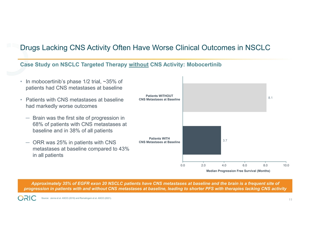 ORIC-114 Demonstrates Potent In Vivo Activity in EGFR Exon 20 Insertion Models In Vivo Efficacy – NSCLC EGFR Exon 20 Insertion Models EGFR Exon 20 insNPH EGFR Exon 20 insASV EGFR Exon 20 insG Vehicle Vehicle Vehicle ORIC-114 (4 mg/kg QD) ORIC-114 (4 mg/kg QD) ORIC-114 (4 mg/kg QD) 112% TGI 127% TGI 110% TGI ORIC-114 demonstrates potent tumor regression in multiple NSCLC EGFR exon 20 insertion models without significant body weight loss Source: Junttila et al. AACR (2021). 10