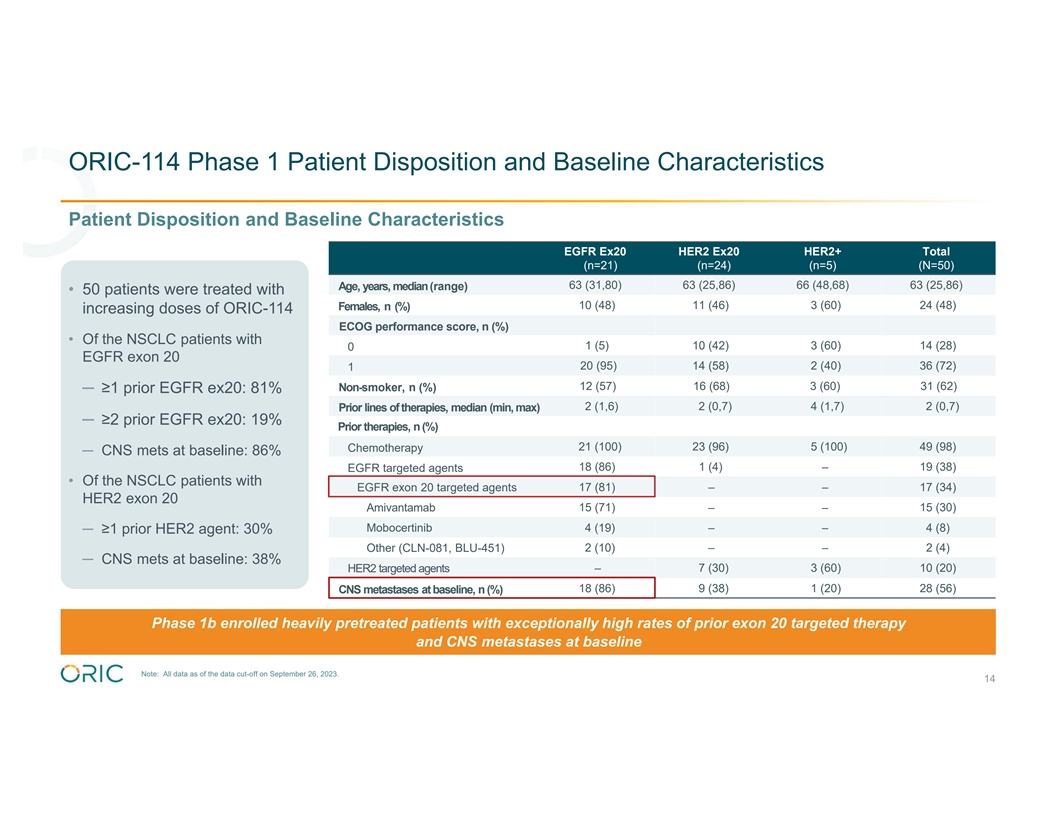 First-In-Human Phase 1b Study of ORIC-114 Phase 1b, Multicenter, Open-Label Study Dose Expansion (Part II) Accelerated Approval Dose Escalation (Part I) All Patients +/- CNS mets Cohorts (Ph 2) Key Eligibility EGFR ex20 NSCLC +/- CNS • Advanced solid tumors naïve to EGFR ex20 therapy RP2D 1 ─ EGFR exon 20 ORIC-114 ─ HER2 exon 20 • Single agent EGFR atypical mutated ─ HER2+ NSCLC +/- CNS • i3+3 design ─ EGFR atypical • Active CNS • Oral QD/BID daily dosing RP2D 2 Candidate metastases allowed RP2Ds HER2 ex20 NSCLC +/- CNS • Prior EGFR exon 20 Selected treatment allowed Primary endpoints: Part I: Safety and candidate RP2Ds; Part II: Dose expansion (RP2D selection) and ORR (per RECIST v1.1) Key secondary endpoints: Part I: PK; Part II: Safety; DOR, CBR and PFS, including intracranial ORR/PFS Initial safety, PK/PD, and preliminary antitumor data from dose escalation (part I) presented at ESMO 2023 Note: ClinicalTrials.gov identifier: NCT05315700. Dose expansion may include QD and BID dosing, fed/fasted dosing. RP2D, recommended Phase 2 dose 13 Screening / Enrollment