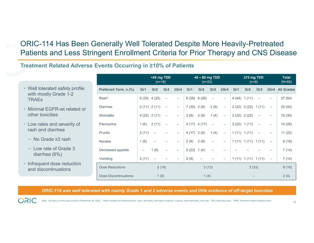 ORIC-114 Phase 1 Patient Disposition and Baseline Characteristics Patient Disposition and Baseline Characteristics EGFR Ex20 HER2 Ex20 HER2+ Total (n=21) (n=24) (n=5) (N=50) 63 (31,80) 63 (25,86) 66 (48,68) 63 (25,86) Age, years, median(range) • 50 patients were treated with 10 (48) 11 (46) 3 (60) 24 (48) Females, n (%) increasing doses of ORIC-114 ECOG performance score, n (%) • Of the NSCLC patients with 1 (5) 10 (42) 3 (60) 14 (28) 0 EGFR exon 20 20 (95) 14 (58) 2 (40) 36 (72) 1 12 (57) 16 (68) 3 (60) 31 (62) Non-smoker, n (%) ─ ≥1 prior EGFR ex20: 81% 2 (1,6) 2 (0,7) 4 (1,7) 2 (0,7) Prior lines of therapies, median (min, max) ─ ≥2 prior EGFR ex20: 19% Prior therapies, n (%) 21 (100) 23 (96) 5 (100) 49 (98) Chemotherapy ─ CNS mets at baseline: 86% 18 (86) 1 (4) – 19 (38) EGFR targeted agents • Of the NSCLC patients with EGFR exon 20 targeted agents 17 (81) – – 17 (34) HER2 exon 20 Amivantamab 15 (71) – – 15 (30) Mobocertinib 4 (19) – – 4 (8) ─ ≥1 prior HER2 agent: 30% Other (CLN-081, BLU-451) 2 (10) – – 2 (4) ─ CNS mets at baseline: 38% HER2 targeted agents – 7 (30) 3 (60) 10 (20) 18 (86) 9 (38) 1 (20) 28 (56) CNS metastases at baseline, n (%) Phase 1b enrolled heavily pretreated patients with exceptionally high rates of prior exon 20 targeted therapy and CNS metastases at baseline Note: All data as of the data cut-off on September 26, 2023. 14