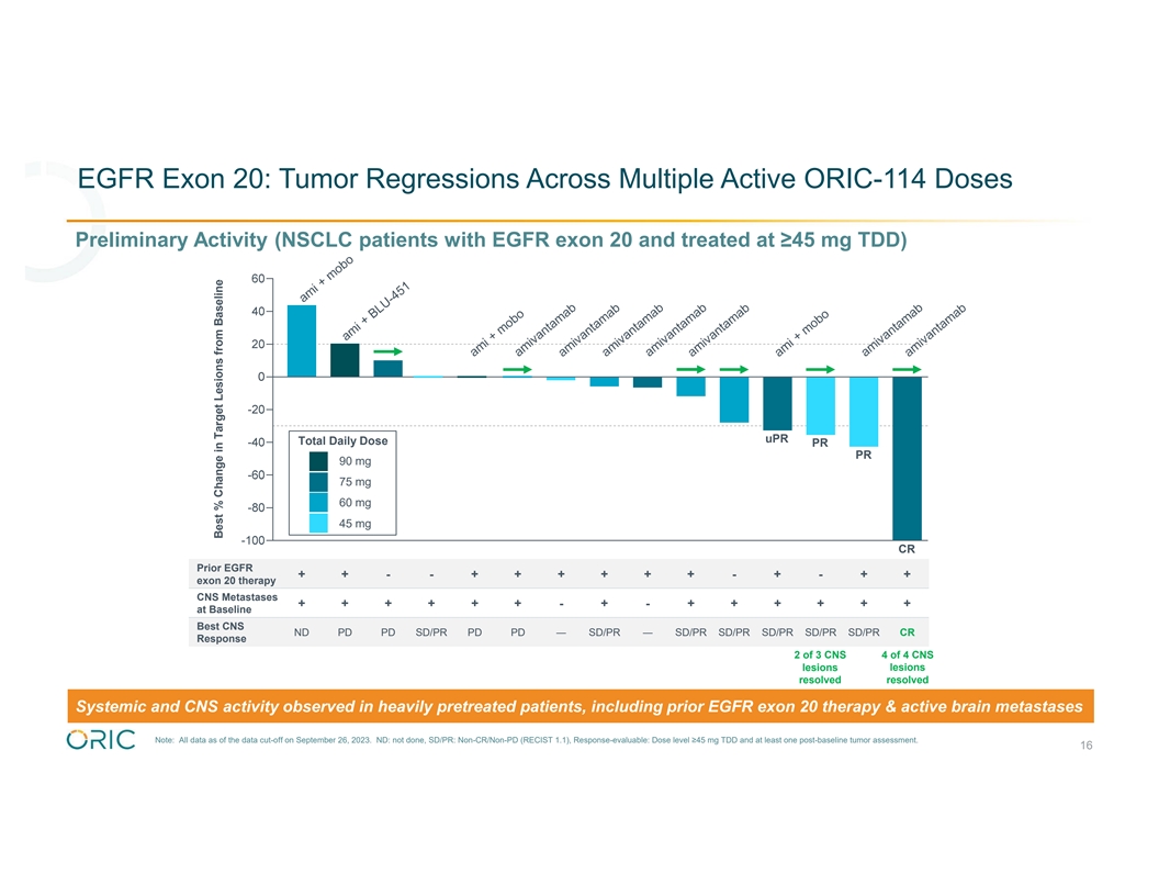 ORIC-114 Has Been Generally Well Tolerated Despite More Heavily-Pretreated Patients and Less Stringent Enrollment Criteria for Prior Therapy and CNS Disease Treatment Related Adverse Events Occurring in ≥10% of Patients <45 mg TDD 45 – 60 mg TDD ≥75 mg TDD Total (n=18) (n=23) (n=9) (N=50) • Well tolerated safety profile Preferred Term, n (%) Gr1 Gr2 Gr3 ≥Gr4 Gr1 Gr2 Gr3 ≥Gr4 Gr1 Gr2 Gr3 ≥Gr4 All Grades with mostly Grade 1-2 Rash* 6 (33) 4 (22) – – 6 (26) 6 (26) – – 4 (44) 1 (11) – – 27 (54) TRAEs Diarrhea 2 (11) 2 (11) – – 7 (30) 2 (9) 2 (9) – 2 (22) 2 (22) 1 (11) – 20 (40) • Minimal EGFR-wt related or other toxicities Stomatitis 4 (22) 2 (11) – – 2 (9) 2 (9) 1 (4) – 2 (22) 2 (22) – – 15 (30) Paronychia 1 (6) 2 (11) – – 4 (17) 4 (17) – – 2 (22) 1 (11) – – 14 (28) • Low rates and severity of rash and diarrhea Pruritis 2 (11) – – – 4 (17) 2 (9) 1 (4) – 1 (11) 1 (11) – – 11 (22) ─ No Grade ≥3 rash Nausea 1 (6) – – – 2 (9) 2 (9) – – 1 (11) 1 (11) 1 (11) – 8 (16) ─ Low rate of Grade 3 Decreased appetite – 1 (6) – – 5 (22) 1 (4) – – – – – – 7 (14) diarrhea (6%) Vomiting 2 (11) – – – 2 (9) – – – 1 (11) 1 (11) 1 (11) – 7 (14) • Infrequent dose reduction Dose Reductions 2 (18) 3 (13) 3 (33) 8 (16) and discontinuations Dose Discontinuations 1 (9) 1 (4) – 2 (4) ORIC-114 was well tolerated with mainly Grade 1 and 2 adverse events and little evidence of off-target toxicities Note: All data as of the data cut-off on September 26, 2023. * Rash includes the following terms: acne, dermatitis, dermatitis acneiform, eczema, hand dermatitis, and rash. TDD, total daily dose. TRAE, treatment related adverse event. 15