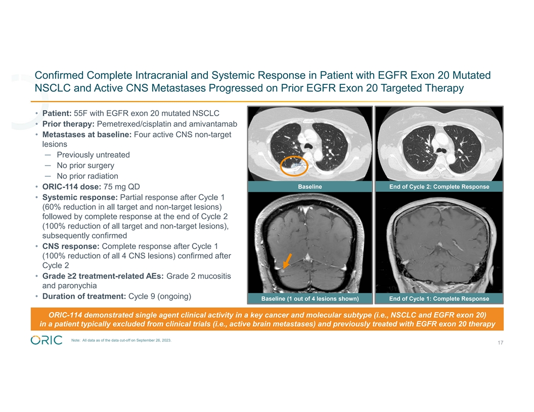 EGFR Exon 20: Tumor Regressions Across Multiple Active ORIC-114 Doses Preliminary Activity (NSCLC patients with EGFR exon 20 and treated at ≥45 mg TDD) uPR Total Daily Dose PR PR 90 mg 75 mg 60 mg 45 mg CR Prior EGFR + + - - + + + + + + - + - + + exon 20 therapy CNS Metastases + + + + + + - + - + + + + + + at Baseline Best CNS ND PD PD SD/PR PD PD ― SD/PR ― SD/PR SD/PR SD/PR SD/PR SD/PR CR Response 2 of 3 CNS 4 of 4 CNS lesions lesions resolved resolved Systemic and CNS activity observed in heavily pretreated patients, including prior EGFR exon 20 therapy & active brain metastases Note: All data as of the data cut-off on September 26, 2023. ND: not done, SD/PR: Non-CR/Non-PD (RECIST 1.1), Response-evaluable: Dose level ≥45 mg TDD and at least one post-baseline tumor assessment. 16 Best % Change in Target Lesions from Baseline