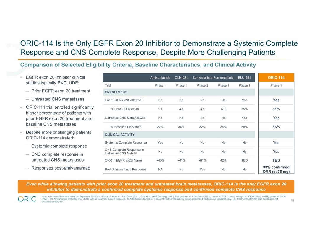 Confirmed Complete Intracranial and Systemic Response in Patient with EGFR Exon 20 Mutated NSCLC and Active CNS Metastases Progressed on Prior EGFR Exon 20 Targeted Therapy • Patient: 55F with EGFR exon 20 mutated NSCLC • Prior therapy: Pemetrexed/cisplatin and amivantamab • Metastases at baseline: Four active CNS non-target lesions ─ Previously untreated ─ No prior surgery ─ No prior radiation Baseline End of Cycle 2: Complete Response • ORIC-114 dose: 75 mg QD • Systemic response: Partial response after Cycle 1 (60% reduction in all target and non-target lesions) followed by complete response at the end of Cycle 2 (100% reduction of all target and non-target lesions), subsequently confirmed • CNS response: Complete response after Cycle 1 (100% reduction of all 4 CNS lesions) confirmed after Cycle 2 • Grade ≥2 treatment-related AEs: Grade 2 mucositis and paronychia • Duration of treatment: Cycle 9 (ongoing) Baseline (1 out of 4 lesions shown) End of Cycle 1: Complete Response ORIC-114 demonstrated single agent clinical activity in a key cancer and molecular subtype (i.e., NSCLC and EGFR exon 20) in a patient typically excluded from clinical trials (i.e., active brain metastases) and previously treated with EGFR exon 20 therapy Note: All data as of the data cut-off on September 26, 2023. 17