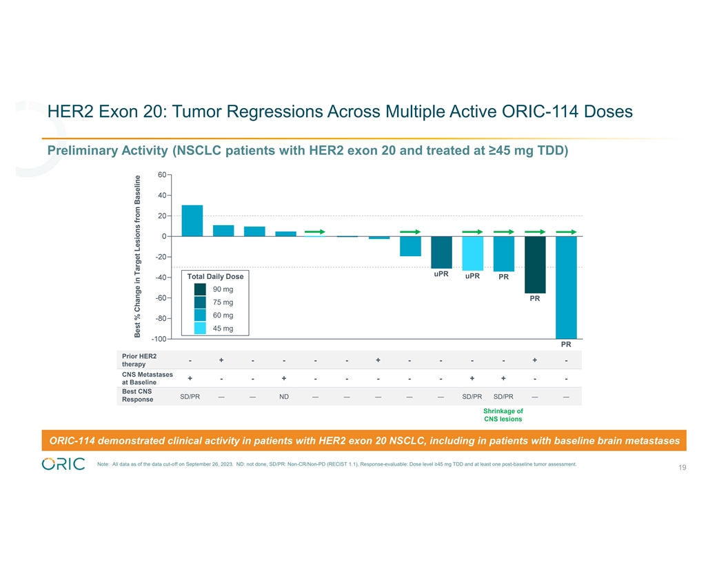ORIC-114 Is the Only EGFR Exon 20 Inhibitor to Demonstrate a Systemic Complete Response and CNS Complete Response, Despite More Challenging Patients Comparison of Selected Eligibility Criteria, Baseline Characteristics, and Clinical Activity • EGFR exon 20 inhibitor clinical Amivantamab CLN-081 Sunvozertinib Furmonertinib BLU-451 ORIC-114 studies typically EXCLUDE: Trial Phase 1 Phase 1 Phase 2 Phase 1 Phase 1 Phase 1 ─ Prior EGFR exon 20 treatment ENROLLMENT (1) ─ Untreated CNS metastases Prior EGFR ex20i Allowed No No No No Yes Yes • ORIC-114 trial enrolled significantly % Prior EGFR ex20i 1% 4% 3% NR 75% 81% higher percentage of patients with Untreated CNS Mets Allowed No No No No Yes Yes prior EGFR exon 20 treatment and baseline CNS metastases % Baseline CNS Mets 22% 38% 32% 34% 58% 86% • Despite more challenging patients, CLINICAL ACTIVITY ORIC-114 demonstrated: Systemic Complete Response Yes No No No No Yes ─ Systemic complete response CNS Complete Response in No No No No No Yes (2) Untreated CNS Mets ─ CNS complete response in untreated CNS metastases ORR in EGFR ex20i Naive ~40% ~41% ~61% 42% TBD TBD 33% confirmed ─ Responses post-amivantamab Post-Amivantamab Response NA No Yes No No ORR (at 75 mg) Even while allowing patients with prior exon 20 treatment and untreated brain metastases, ORIC-114 is the only EGFR exon 20 inhibitor to demonstrate a confirmed complete systemic response and confirmed complete CNS response Note: All data as of the data cut-off on September 26, 2023. Source: Park et al. J Clin Oncol (2021), Zhou et al. JAMA Oncology (2021), Piotrowska et al. J Clin Oncol (2023), Han et al. WCLC (2023), Wang et al. ASCO (2023), and Nguyen et al. ASCO (2023). (1) Amivantamab prohibited prior EGFR exon 20 treatment in dose expansion. CLN-081 allowed prior EGFR exon 20 treatment selectively during accelerated titration dose escalation only. (2) Treatment history for brain metastases not 18 disclosed for BLU-451.