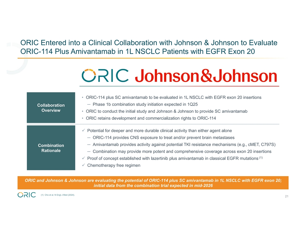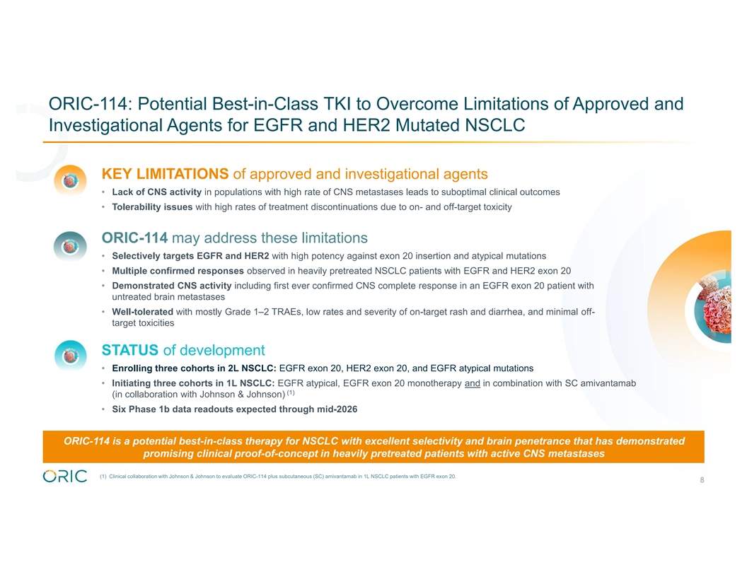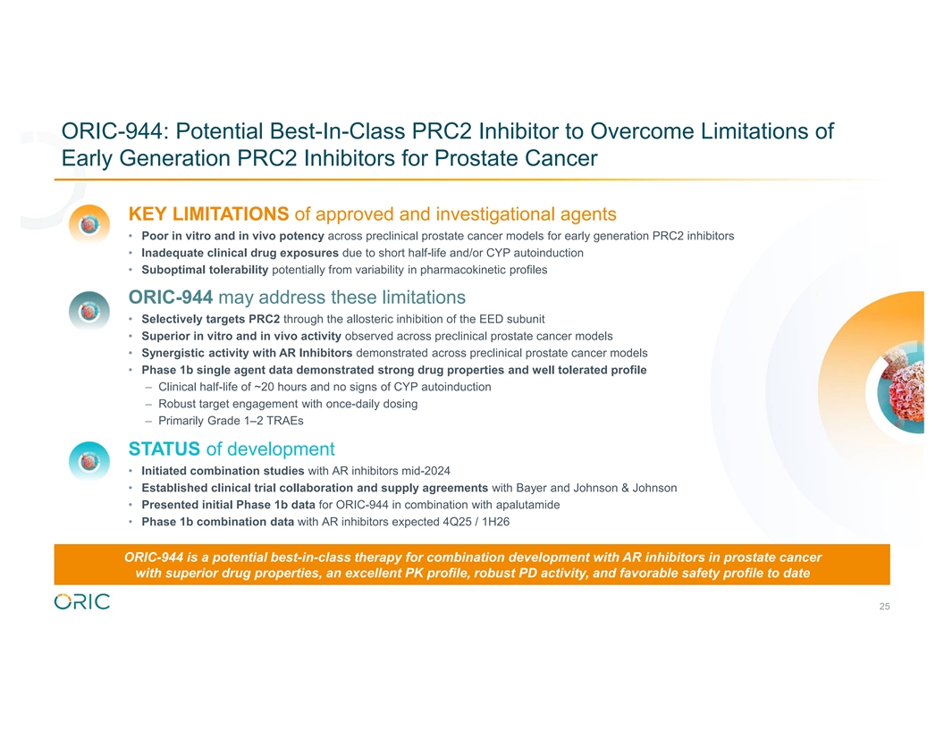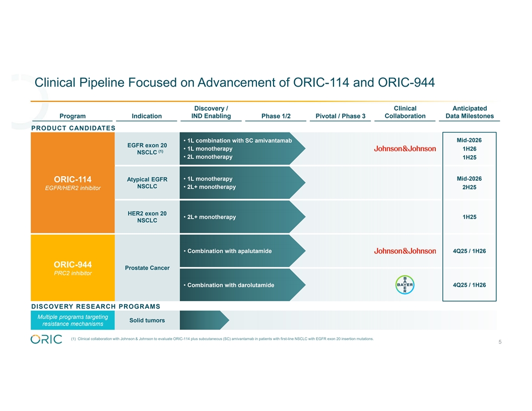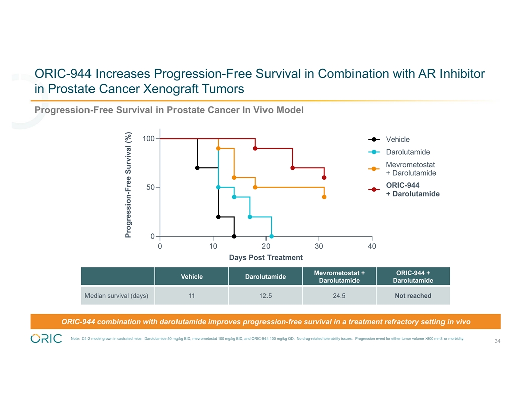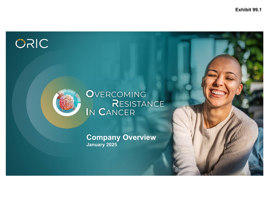 Forward-Looking Statements This presentation contains forward-looking statements that involve substantial risks and uncertainties. All statements other than statements of historical facts contained in this presentation, including statements regarding ORIC Pharmaceuticals, Inc.’s (“ORIC”, “we”, “us” or “our”) future financial condition, results of operations, business strategy and plans, and objectives of management for future operations, as well as statements regarding industry trends, are forward-looking statements. In some cases, you can identify forward-looking statements by terminology such as “anticipate,” “believe,” “continue,” “could,” “estimate,” “expect,” “intend,” “may,” “plan,” “potentially,” “predict,” “should,” “will” or the negative of these terms or other similar expressions. Forward-looking statements contained in this presentation also include, but are not limited to, statements regarding: our development plans and timelines; the potential advantages of our product candidates and programs; plans for the clinical trials and development of ORIC-114 and ORIC-944; ORIC-114 and ORIC-944 clinical outcomes, which may materially changes as patient enrollment continues or more patient data becomes available; the expected timing of reporting data from our clinical trials; our anticipated milestones and clinical updates; and the period over which we estimate our existing cash and investments will be sufficient to fund our current operating plan. We have based these forward-looking statements largely on our current expectations and projections about future events and trends that we believe may affect our financial condition, results of operations, business strategy and financial needs. These forward-looking statements are subject to a number of risks, uncertainties and assumptions, including, among other things: the timing of the initiation, progress and results of our preclinical studies and clinical trials; risks associated with the process of discovering, developing and commercializing drugs that are safe and effective for use in humans and operating as an early clinical stage company; negative impacts of health emergencies, economic instability or international conflicts on our operations, including clinical trials; the potential for current or future clinical trials of product candidates to differ from preclinical, initial, interim, preliminary or expected results; our ability to advance product candidates into, and successfully complete, clinical trials; the timing or likelihood of regulatory filings and approvals; changes in our plans to develop and commercialize our product candidates; our estimates of the number of patients who suffer from the diseases we are targeting and the number of patients that may enroll in our clinical trials; the commercializing of our product candidates, if approved; our ability to successfully manufacture and supply our product candidates for clinical trials and for commercial use, if approved; potential benefits and costs of strategic arrangements, licensing and/or collaborations; the risk of the occurrence of any event, change or other circumstance that could give rise to the termination of our license or collaboration agreements; our estimates regarding expenses, future revenue, capital requirements and needs for financing and our ability to obtain capital; the sufficiency of our existing cash and investments to fund our future operating expenses and capital expenditure requirements; our ability to retain the continued service of our key personnel and to identify, hire and retain additional qualified professionals; the implementation of our business model and strategic plans for our business and product candidates; the scope of protection we are able to establish and maintain for intellectual property rights, product candidates and our pipeline; our ability to contract with third-party contract research organizations, suppliers and manufacturers and their ability to perform adequately; the pricing, coverage and reimbursement of our product candidates, if approved; developments relating to our competitors and our industry, including competing product candidates and therapies; regulatory developments in the United States and foreign countries; general economic and market conditions; and the other risks, uncertainties and assumptions discussed in the public filings we have made and will make with the Securities and Exchange Commission (“SEC”). These risks are not exhaustive. New risk factors emerge from time to time and it is not possible for our management to predict all risk factors, nor can we assess the impact of all factors on our business or the extent to which any factor, or combination of factors, may cause actual results to differ materially from those contained in, or implied by, any forward-looking statements. You should not rely upon forward-looking statements as predictions of future events. Although we believe that the expectations reflected in the forward-looking statements are reasonable, we cannot guarantee future results, levels of activity, performance or achievements. This presentation also contains estimates and other statistical data made by independent parties and by us relating to market size and other data about our industry. This data involves a number of assumptions and limitations, and you are cautioned not to give undue weight to such data and estimates. In addition, projections, assumptions and estimates of our future performance and the future performance of the markets in which we operate are necessarily subject to a high degree of uncertainty and risk. Except as required by law, we undertake no obligation to update any statements in this presentation for any reason after the date of this presentation. We have filed Current Reports on Form 8-K, Quarterly Reports on Form 10-Q, Annual Reports on Form 10-K, and other documents with the SEC. You 
