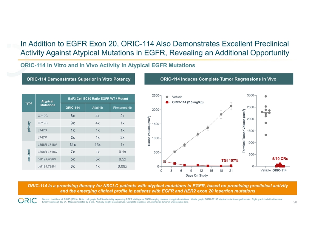 In Addition to EGFR Exon 20, ORIC-114 Also Demonstrates Excellent Preclinical Activity Against Atypical Mutations in EGFR, Revealing an Additional Opportunity ORIC-114 In Vitro and In Vivo Activity in Atypical EGFR Mutations ORIC-114 Demonstrates Superior In Vitro Potency ORIC-114 Induces Complete Tumor Regressions In Vivo 3000 BaF3 Cell EC50 Ratio EGFR WT / Mutant Atypical Type Mutations 2500 ORIC-114 Afatinib Firmonertinib G719C 8x 4x 2x 2000 G719S 9x 4x 1x L747S 1x 1x 1x 1500 L747P 2x 1x 2x 1000 L858R L718V 31x 13x 1x L858R L718Q 7x 1x 0.1x 500 5/10 CRs del19 G796S 5x 5x 0.5x TGI 107% del19 L792H 3x 1x 0.09x 0 Vehicle ORIC-114 ORIC-114 is a promising therapy for NSCLC patients with atypical mutations in EGFR, based on promising preclinical activity and the emerging clinical profile in patients with EGFR and HER2 exon 20 insertion mutations Source: Junttila et al. ESMO (2023). Note: Left graph, Ba/F3 cells stably expressing EGFR wild-type or EGFR carrying classical or atypical mutations. Middle graph, EGFR G719S atypical mutant xenograft model. Right graph: Individual terminal tumor volumes at day 21. Mean is indicated by a line. No body weight loss observed. Complete response, CR, defined as tumor of undetectable size. 20 acquired primary 3 Tumor Volume (mm )