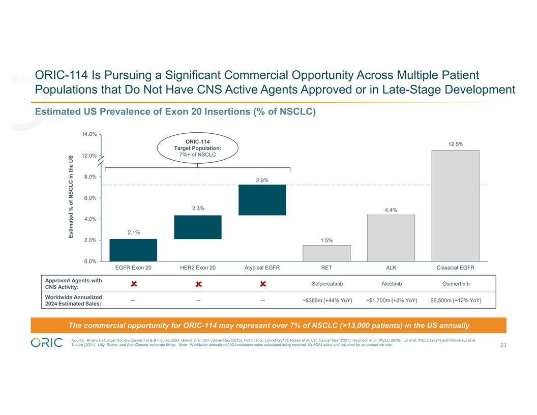 ORIC-114 Is Pursuing a Significant Commercial Opportunity Across Multiple Patient Populations that Do Not Have CNS Active Agents Approved or in Late-Stage Development Estimated US Prevalence of Exon 20 Insertions (% of NSCLC) 12.0% 14.0% ORIC-114 12.5% Target Population: 7%+ of NSCLC 10.0% 12.0% 8.0% 2.9% 6.0% 2.3% 4.4% 4.0% 2.1% 2.0% 1.5% 0.0% EGFR Exon 20 HER2 Exon 20 Atypical EGFR RET ALK Classical EGFR Approved Agents with Selpercatinib Alectinib Osimertinib CNS Activity:ûûû Worldwide Annualized ─ ─ ─ ~$365m (+44% YoY) ~$1,700m (+2% YoY) $6,500m (+12% YoY) 2024 Estimated Sales: The commercial opportunity for ORIC-114 may represent over 7% of NSCLC (>13,000 patients) in the US annually Source: American Cancer Society Cancer Facts & Figures 2024, Gainor et al. Clin Cancer Res (2013), Hirsch et al. Lancet (2017), Rosen et al. Clin Cancer Res (2021), Heymach et al. WCLC (2018), Le et al. WCLC (2024) and Robichaux et al. Nature (2021). Lilly, Roche, and AstraZeneca corporate filings. Note: Worldwide annualized 2024 estimated sales calculated using reported 1Q-3Q24 sales and adjusted for an annual run rate. 23 Estimated % of NSCLC in the US