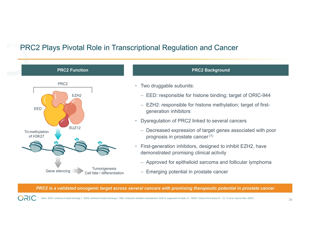 ORIC-944: Potential Best-In-Class PRC2 Inhibitor to Overcome Limitations of Early Generation PRC2 Inhibitors for Prostate Cancer KEY LIMITATIONS of approved and investigational agents • Poor in vitro and in vivo potency across preclinical prostate cancer models for early generation PRC2 inhibitors • Inadequate clinical drug exposures due to short half-life and/or CYP autoinduction • Suboptimal tolerability potentially from variability in pharmacokinetic profiles ORIC-944 may address these limitations • Selectively targets PRC2 through the allosteric inhibition of the EED subunit • Superior in vitro and in vivo activity observed across preclinical prostate cancer models • Synergistic activity with AR Inhibitors demonstrated across preclinical prostate cancer models • Phase 1b single agent data demonstrated strong drug properties and well tolerated profile – Clinical half-life of ~20 hours and no signs of CYP autoinduction – Robust target engagement with once-daily dosing – Primarily Grade 1–2 TRAEs STATUS of development • Initiated combination studies with AR inhibitors mid-2024 • Established clinical trial collaboration and supply agreements with Bayer and Johnson & Johnson • Presented initial Phase 1b data for ORIC-944 in combination with apalutamide • Phase 1b combination data with AR inhibitors expected 4Q25 / 1H26 ORIC-944 is a potential best-in-class therapy for combination development with AR inhibitors in prostate cancer with superior drug properties, an excellent PK profile, robust PD activity, and favorable safety profile to date 25