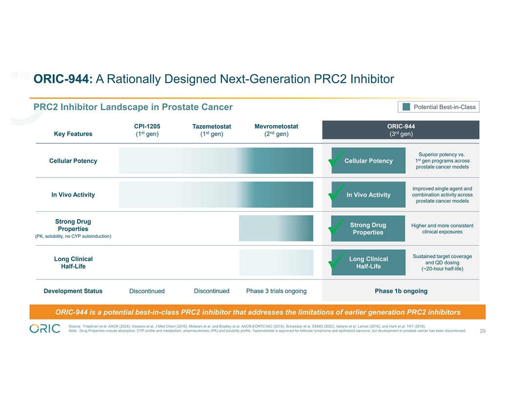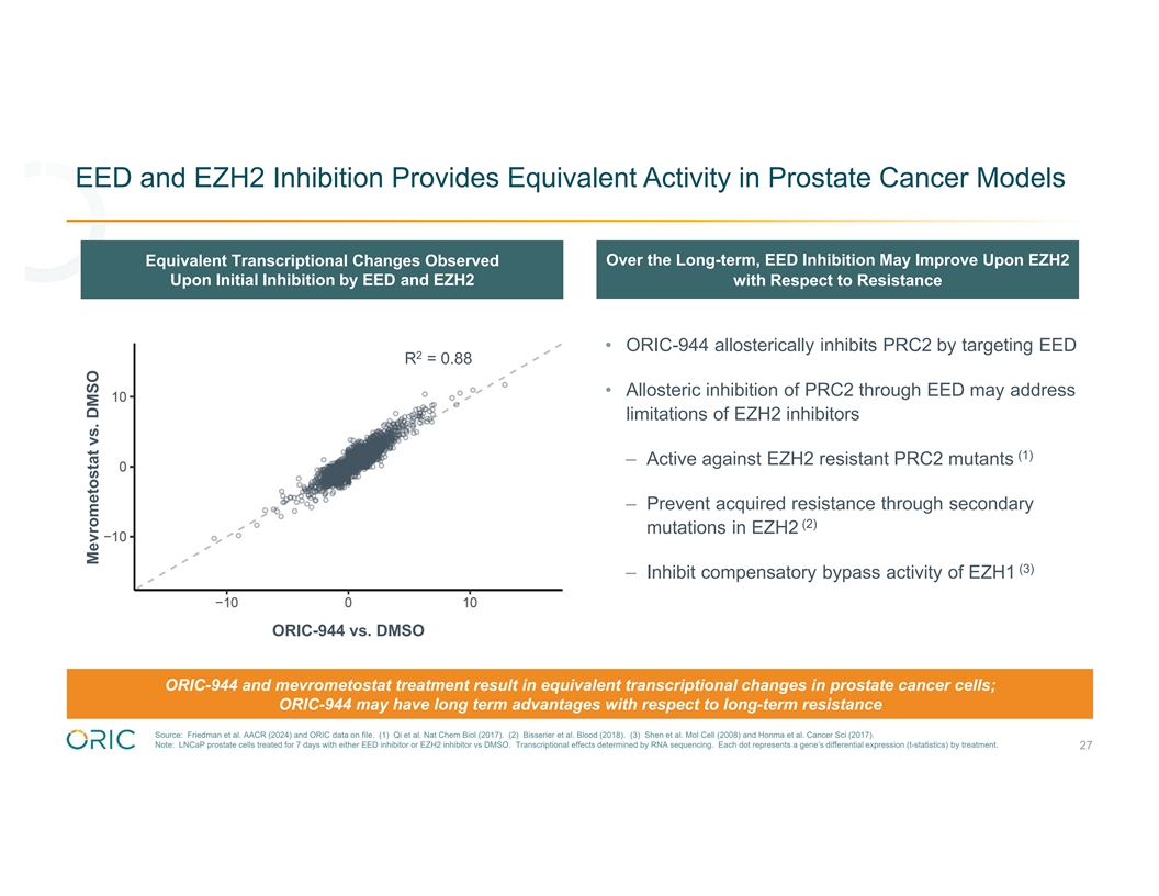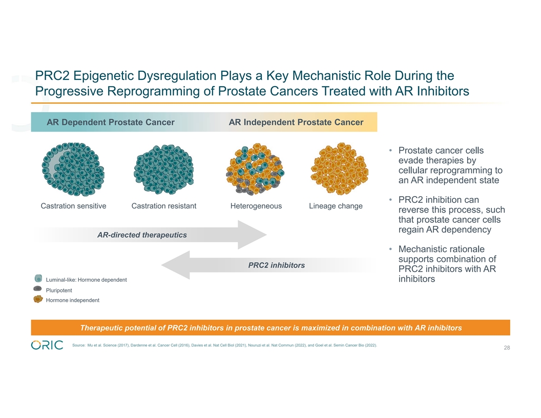 EED and EZH2 Inhibition Provides Equivalent Activity in Prostate Cancer Models Over the Long-term, EED Inhibition May Improve Upon EZH2 Equivalent Transcriptional Changes Observed Upon Initial Inhibition by EED and EZH2 with Respect to Resistance • ORIC-944 allosterically inhibits PRC2 by targeting EED 2 R = 0.88 • Allosteric inhibition of PRC2 through EED may address limitations of EZH2 inhibitors (1) – Active against EZH2 resistant PRC2 mutants – Prevent acquired resistance through secondary (2) mutations in EZH2 (3) – Inhibit compensatory bypass activity of EZH1 ORIC-944 vs. DMSO ORIC-944 and mevrometostat treatment result in equivalent transcriptional changes in prostate cancer cells; ORIC-944 may have long term advantages with respect to long-term resistance Source: Friedman et al. AACR (2024) and ORIC data on file. (1) Qi et al. Nat Chem Biol (2017). (2) Bisserier et al. Blood (2018). (3) Shen et al. Mol Cell (2008) and Honma et al. Cancer Sci (2017). Note: LNCaP prostate cells treated for 7 days with either EED inhibitor or EZH2 inhibitor vs DMSO. Transcriptional effects determined by RNA sequencing. Each dot represents a gene’s differential expression (t-statistics) by treatment. 27 Mevrometostat vs. DMSO