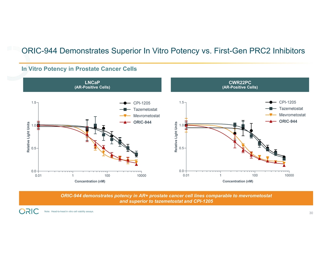 ORIC-944: A Rationally Designed Next-Generation PRC2 Inhibitor Potential Best-in-Class PRC2 Inhibitor Landscape in Prostate Cancer CPI-1205 Tazemetostat Mevrometostat ORIC-944 st st nd rd Key Features (1 gen) (1 gen) (2 gen) (3 gen) Superior potency vs. st 1 gen programs across Cellular Potency Cellular Potency Cellular Potency prostate cancer models ü Improved single agent and combination activity across In Vivo Activity In Vivo A In Vivo Activity ctivity prostate cancer models ü Strong Drug Strong Drug Strong Drug Higher and more consistent Properties clinical exposures Properties Properties (PK, solubility, no CYP autoinduction)ü Sustained target coverage Long Clinical Long Long Clinical Clinical and QD dosing Half-Life Half Half- -Life Life (~20-hour half-life) ü Development Status Discontinued Discontinued Phase 3 trials ongoing Phase 1b ongoing ORIC-944 is a potential best-in-class PRC2 inhibitor that addresses the limitations of earlier generation PRC2 inhibitors Source: Friedman et al. AACR (2024), Vaswani et al. J Med Chem (2016), Motwani et al. and Bradley et al. AACR-EORTC-NCI (2019), Schweizer et al. ESMO (2022), Italiano et al. Lancet (2018), and Harb et al. TAT (2018). Note: Drug Properties include absorption, CYP profile and metabolism, pharmacokinetic (PK) and solubility profile. Tazemetostat is approved for follicular lymphoma and epithelioid sarcoma, but development in prostate cancer has been discontinued. 29
